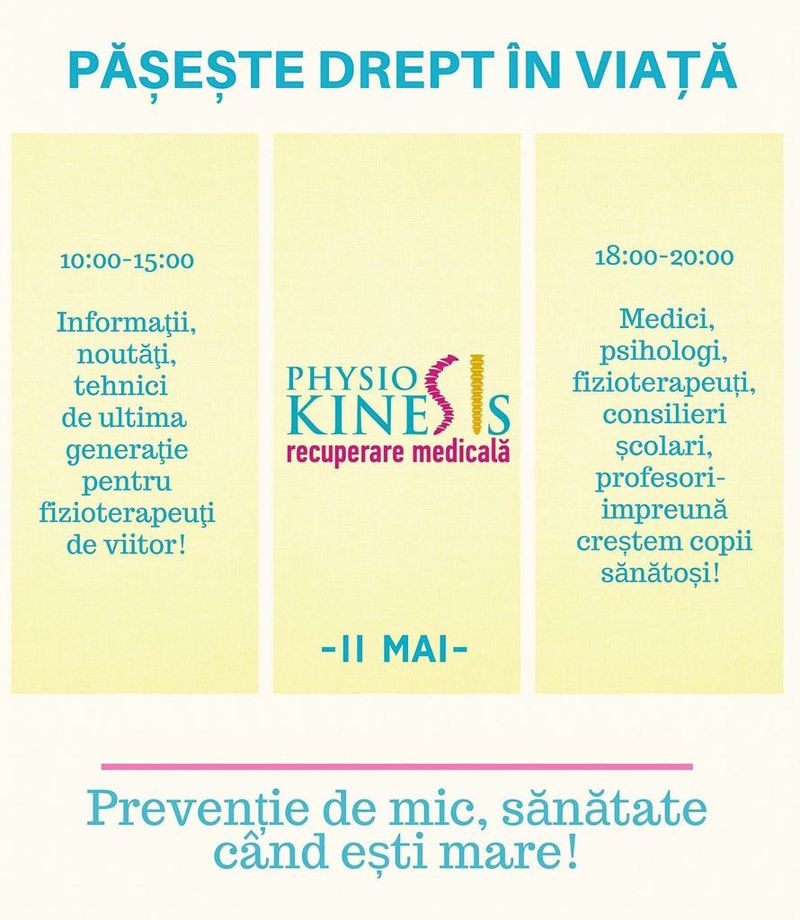 Evaluarea postural globală a copiilor cu tehnologia Global Postural System de la PhisioKinesis-Recuperare Medicală, un aparat unic în Bacău, a dezvăluit o realitate alarmantă: peste 90% dintre copiii evaluați au deformări ale coloanei. „Pășește drept în viață!” este o campanie demarată încă din luna martie în câteva școli, ca primă etapă a unui proiect de conștientizare și educație, care s-a adresat elevilor cu vârste între 10 și 14 ani. Cea de-a doua parte a proiectului vizează în mod direct specialiștii din domeniul recuperării medicale, pe de-o parte, și părinții, de cealaltă parte. În această direcție, vineri, 11 mai, va avea loc Conferința „Pășește drept în viață!”.