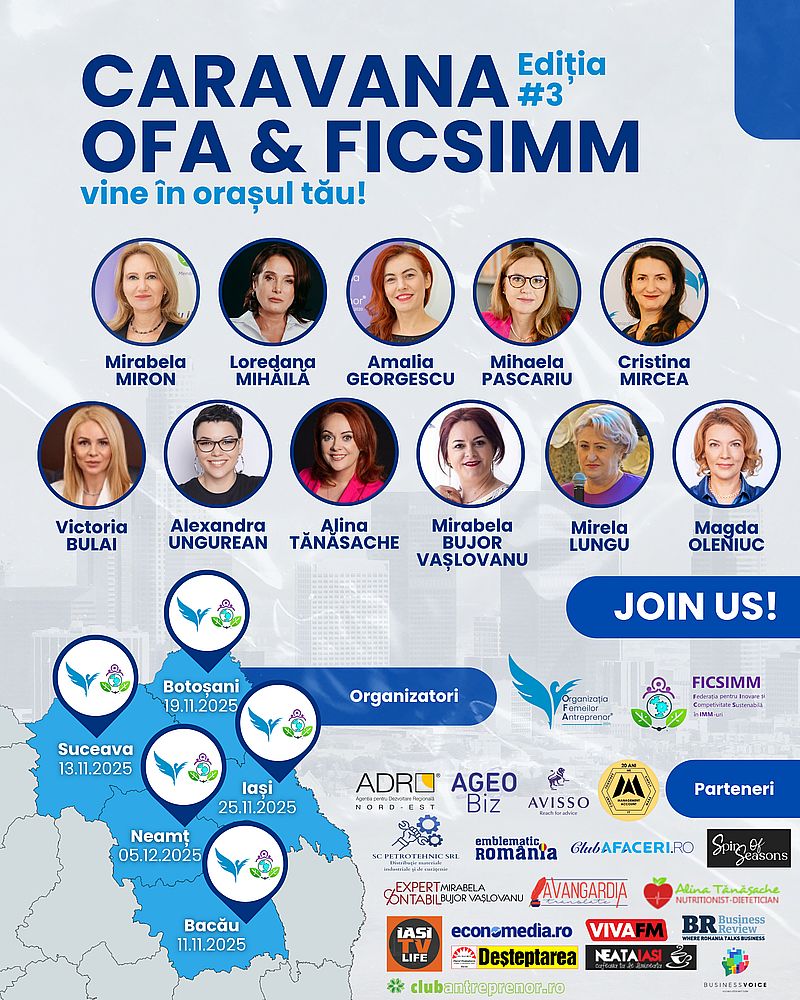 Federația pentru Inovare și Competitivitate Sustenabilă în IMM-uri (FICSIMM) și Patronatul Organizația Femeilor Antreprenor (OFA) anunță lansarea celei de-a treia ediții a Caravanei OFA & FICSIMM, care se va desfășura în perioada 11 noiembrie – 5 decembrie 2025, în județele din Regiunea Nord-Est a României.