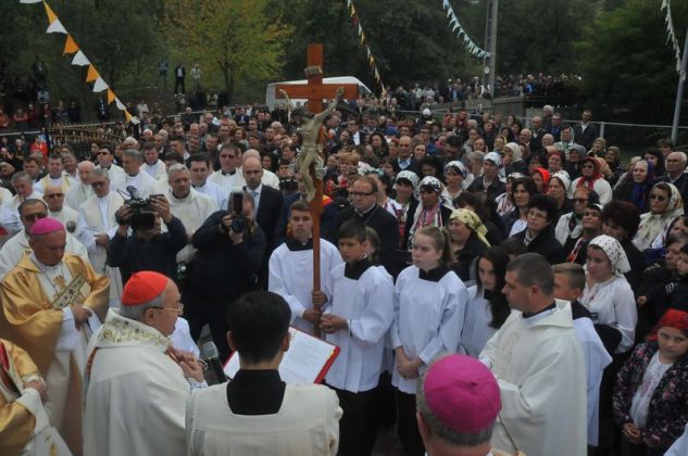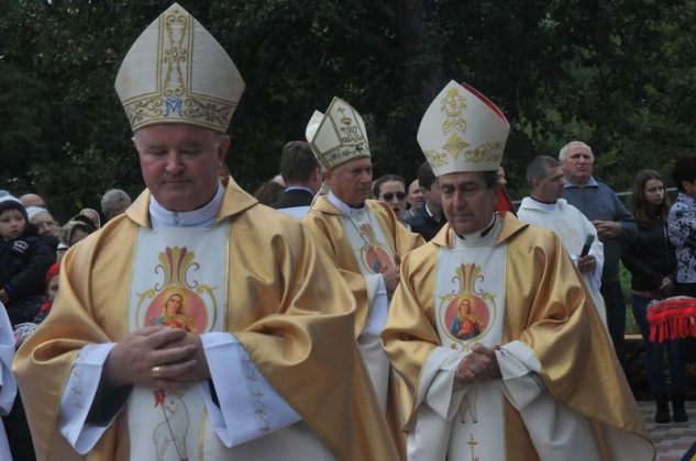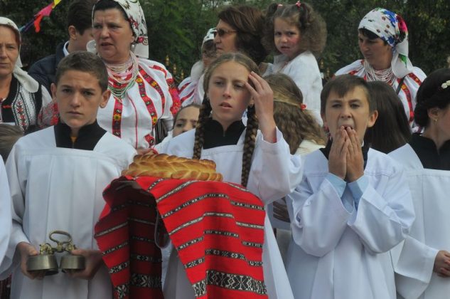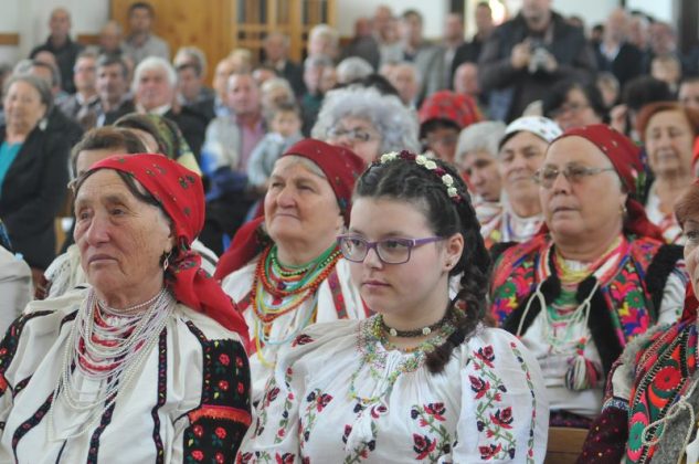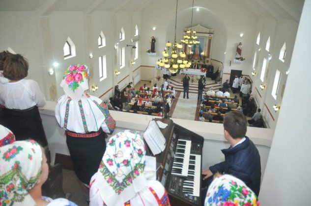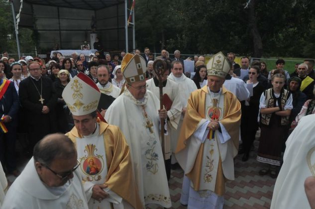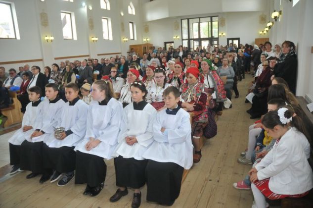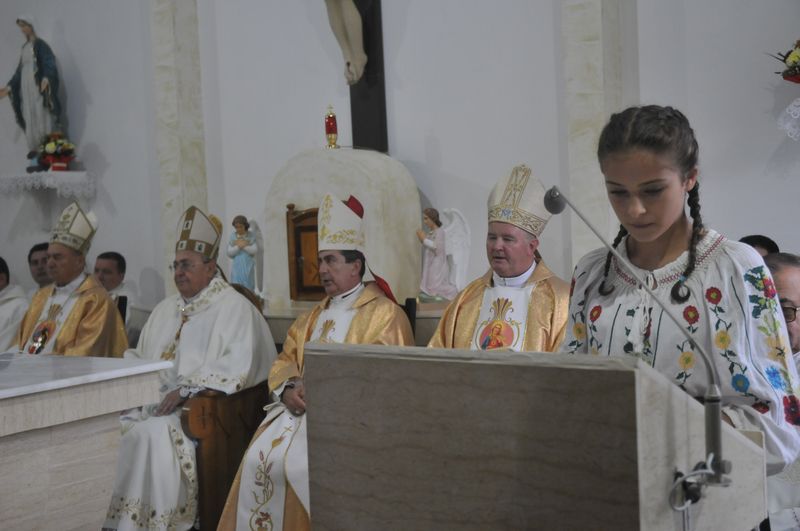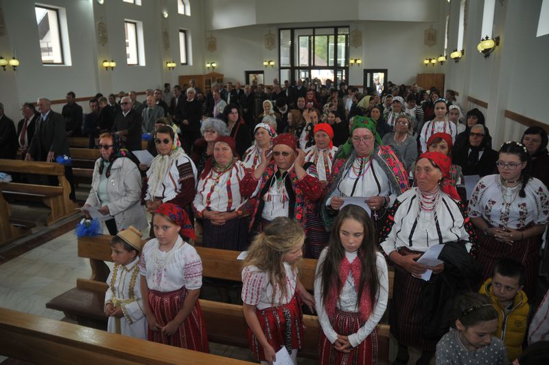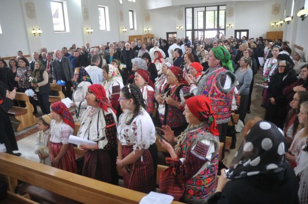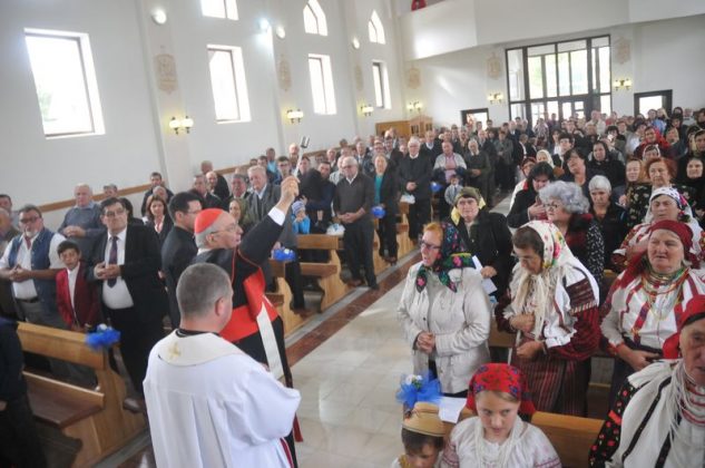 Oaspeţii au fost întâmpinaţi cu pâine şi sare la Biserica „Naşterea Sfintei Fecioare Maria”, de sute de credincioşi din toate parohiile catolice din zonă, de copii şi tineri, îmbrăcaţi de sărbătoare, în costume naţionale.