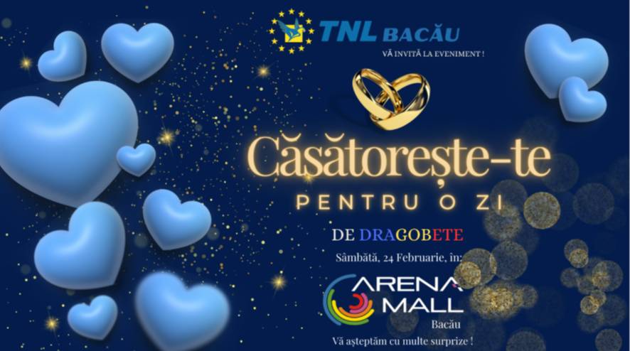 Noi, Tinerii Liberali băcăuani (TNL Bacău), în numele tuturor cuplurilor căsătorite pentru o zi în edițiile trecute, transmitem mulțumiri Arena Mall, pentru sprijinul pe care oferit, partenerilor și sponsorilor care în fiecare an au susținut această acțiune, în așa fel încât să vă simțiți cu adevărat împliniți de Dragobete.