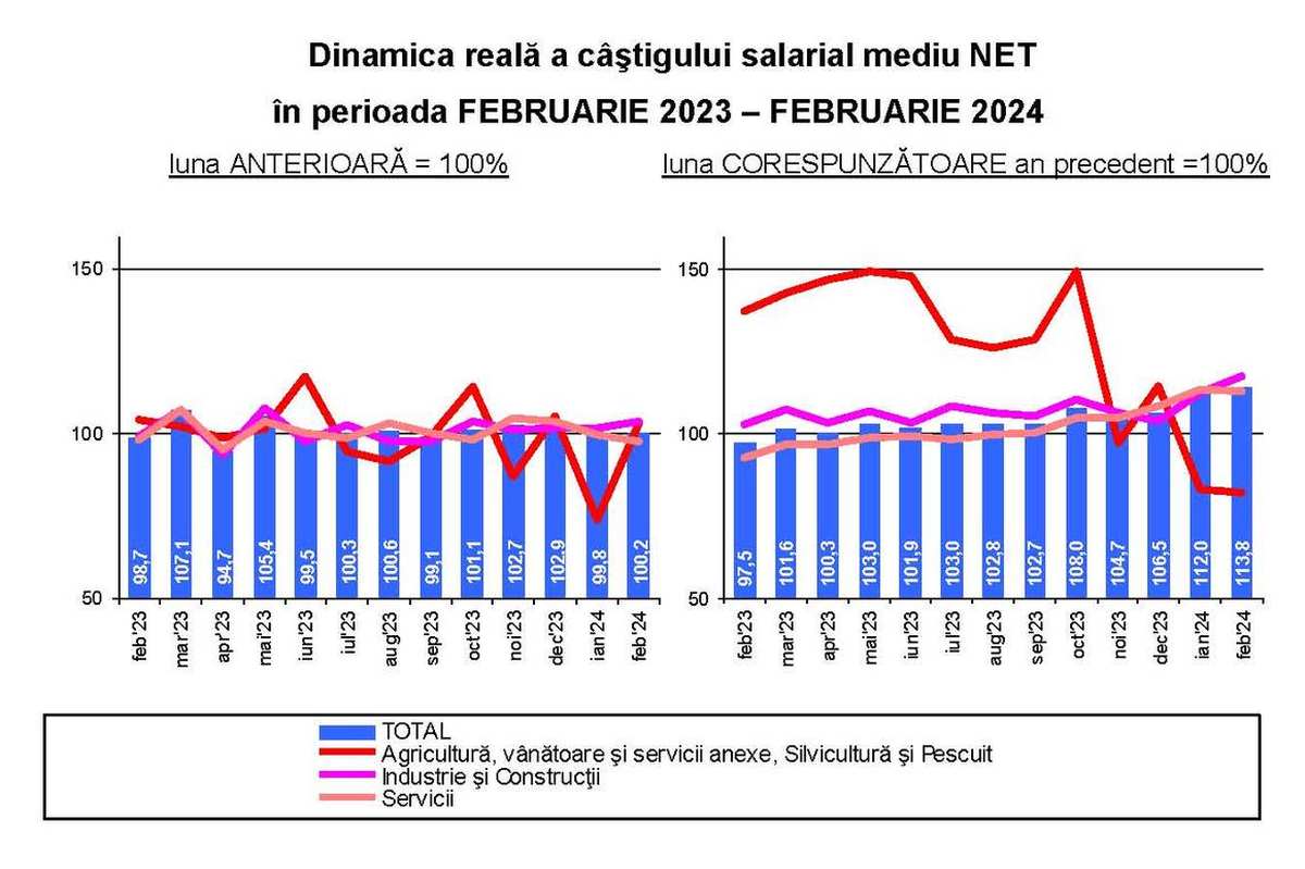 În comparație cu luna ianuarie 2024, câștigul salarial mediu net în județul Bacău a înregistrat o ușoară creștere, de 0,2%, în prețuri comparabile. Față de aceeași perioadă a anului precedent, februarie 2023, se observă o creștere semnificativă de 13,8% în câștigurile salariale, în aceleași condiții de comparație.