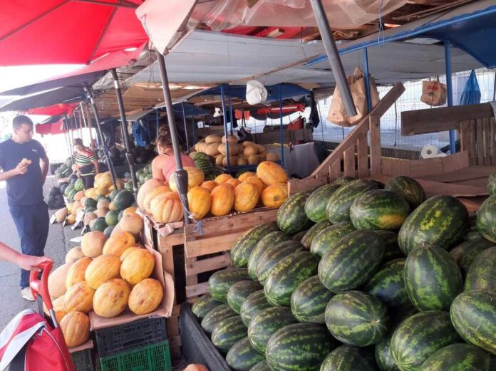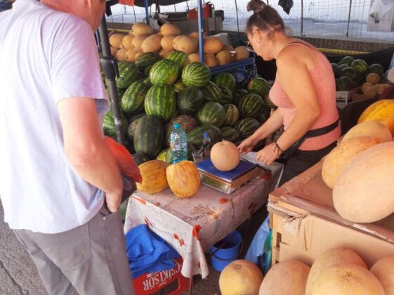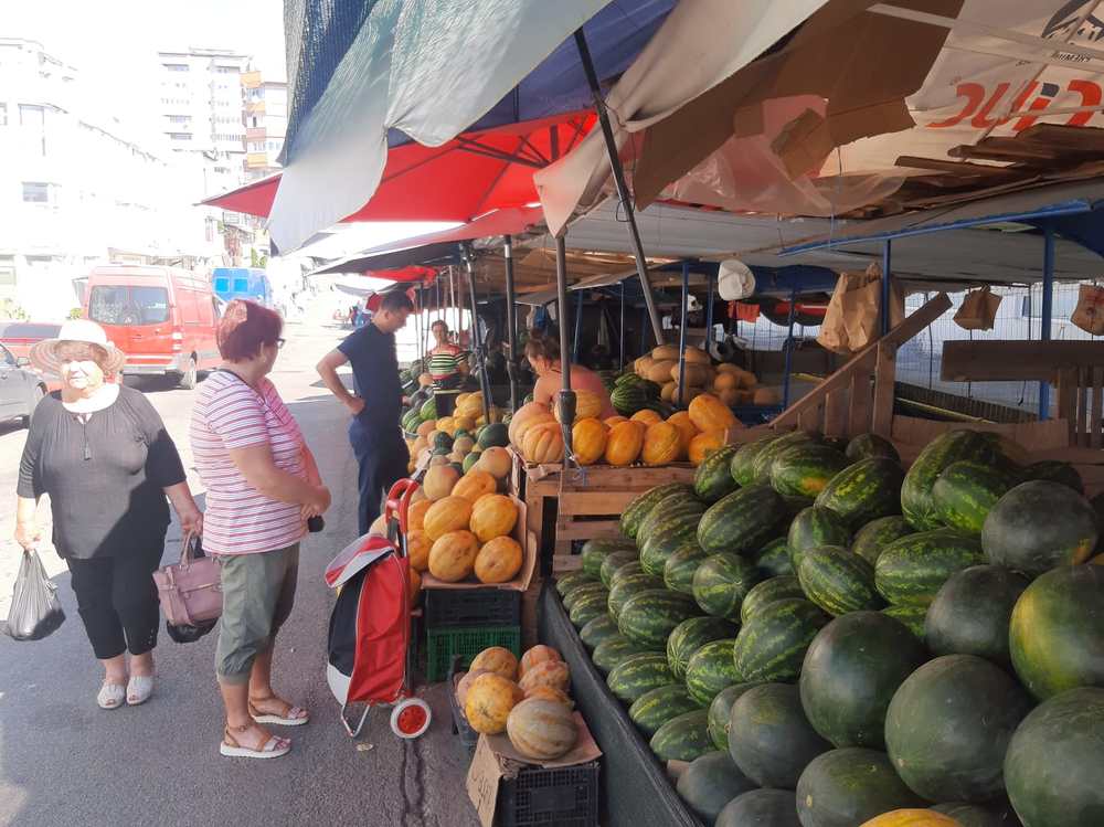 În aparență, orice zi e ca oricare alta. Da… E vară, e cald și e timpul bogăției pe tarabe. Și e adevărat că tarabele sunt pline. Pline și colorate. Dar, înainte de a intra în piață, ne atrag atenția niște comercianți de alte cele. Butoaie de toate felurile, zdrobitor de struguri, etc. E final de august și a fost o vară fierbinte. Strugurii s-au copt iar românii s-au apucat de făcut vin. Se zice că e un an bun, că strugurii sunt dulci iar producția de vin 2024 va fi de calitate. Vom vedea! Apoi urmează vestita alee cu pepeni. Am senzația că sunt mai puțini decât în anii trecuți. În zonă își fac treaba producătorii din zona Galați și inevitabil o întâlnesc pe mai vechea prietenă, doamna Camelia din Pechea – Galați. Mă întâmpină zâmbind și întreabă dacă iar o „intervievez”. Și tot ca de fiecare dată nu vrea să stea la poză că nu și-a pus machiajul și ținute de seară. Trecând peste protocoale, doamna Camelia spune că s-au făcut pepeni mulți și buni și anul ăsta. „E adevărat că este problemă cu seceta dar noi avem irigații și am făcut treabă bună”, explică doamna Camelia care mă invită la o felie de pepene galben dulce. Are pepeni galbeni și „răpănoși” și „făinoși”, iar pepenii verzi sunt de toate mărimile și chiar de pus la murat, că a fost cerere. Oamenii care au venit cu pepeni din zona Galați dorm în mașini, chiar în fața „tarabelor”. Se spală „la lighean” și mănâncă așa cum pot. Dar sunt români și știu să facă haz de necaz dar să se și adapteze la orice situație. Familiile lor au rămas la munca câmpului iar ei sunt la vânzare. Doamna Camelia vine de 20 de ani cu pepeni în Bacău. Înainte mergea la Făgăraș, dar când și-au făcut socotelile au realizat că cel mai bine e aici. Și are pepeni buni, lucru confirmat și de faptul că are aceiași clienți de ani de zile.