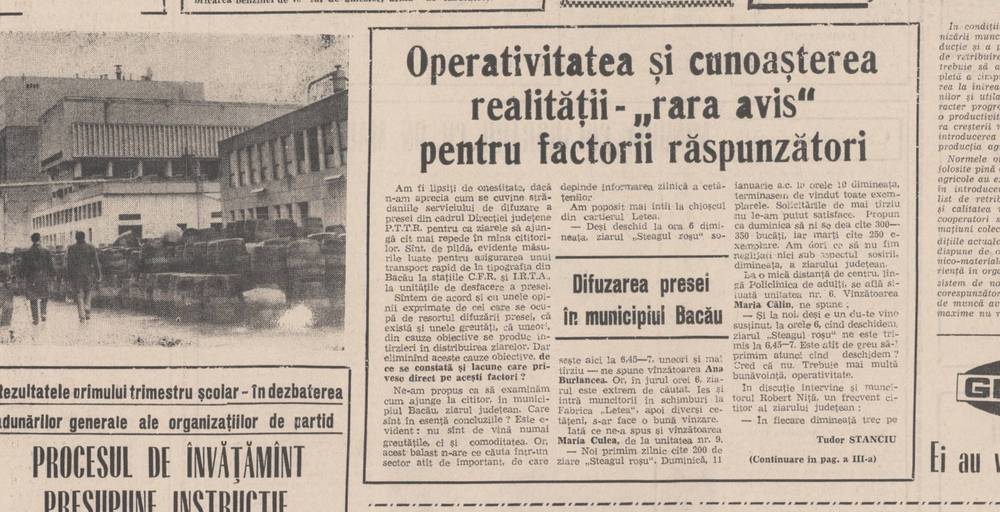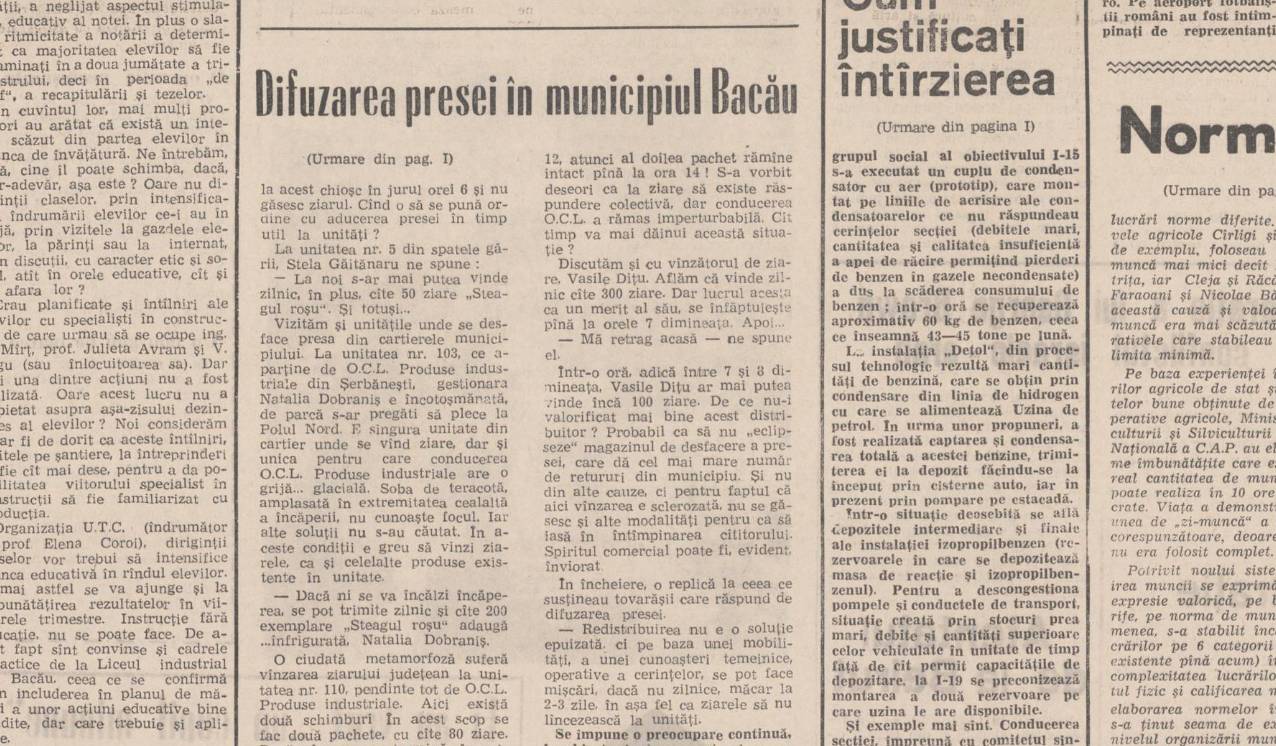 Pe 20 ianuarie 1970, cotidianul Steagul Roșu publica un articol critic la adresa sistemului de distribuție a presei în municipiul Bacău, evidențiind lipsa de operativitate și deficiențele organizatorice ale factorilor răspunzători. Deși serviciul de difuzare din cadrul Direcției județene P.T.T.R. era apreciat pentru eforturile sale de a livra rapid ziarele, existau numeroase probleme care afectau procesul.