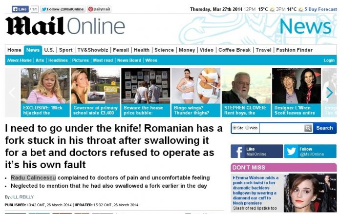 Tanarul bacauan care a inghitit o furculita a devenit vedeta in Marea Britanie, dupa ce povestea sa a aparut in Daily Mail.