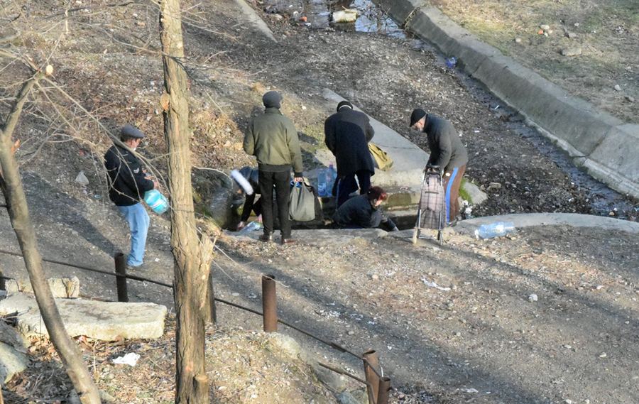 Gheorghe Alexa: Am 84 de ani! Câtă apă am cărat de aici! Acum am umplut un bidon. Mă ajută și nevasta cu unul. Facem mișcare. De nevoie. Ca la bătrânețe, în cârjă. Avariile se întâmplă. Noi consumăm puțin. Izvorul ăsta e demult. Dinainte de Ceaușescu. Nu se construiseră blocurile. Erau case aici. L-au amenajat prin ’70. Lucram eu în Prefabricate pe atunci. E bun că nu seacă nici vara. La o nevoie, suntem obișnuiți cu statul la coadă, da ai de unde lua.