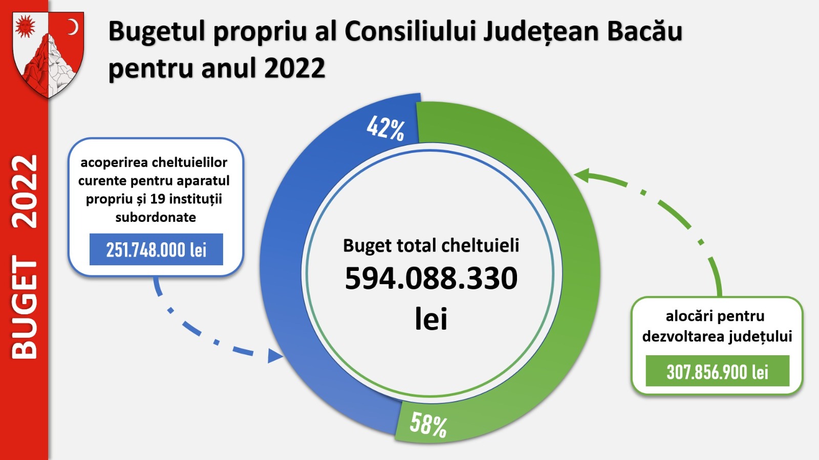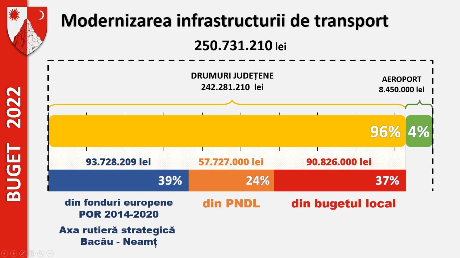 Acesta a mai spus că, în acest an, bugetul Consiliului Județean se va prioritiza pe infrastructură rutieră, inclusiv de transport, pentru că în calcul intră și bugetul aeroportului, – reprezentând 76 % din totalul bugetului județului, și pe infrastructură de sănătate – circa 17%. În plus, vor mai fi investiții de interes județean în asociere cu UAT-urile, care se cifrează la 5 milioane de lei – 2 %, și investiții noi, totalizând peste 12,5 milioane de lei – 4%. La acest ultim capitol, banii vor fi destinați întocmirii documentațiilor tehnice, suma urmând să crească pe măsură ce vor fi obținute finanțări pentru fiecare proiect, din fonduri europene sau de la bugetul propriu, al județului. În privința sumelor alocate pentru modernizarea infrastructurii de transport, reținem că drumurile județene vor beneficia de cei mai mulți bani – peste 250 de milioane de lei, reprezentând 96% din totalul alocărilor. Circa 93,7 milioane de lei sunt bani atrași din sursele europene  – 39 %, respectiv POR 2014-2020, și se vor duce în lucrările la Axa rutieră strategică Bacău – Neamț. În plus, de la bugetul județului, s-a aprobat suma totală de 90,8 milioane – 37, în vreme ce de la bugetul de stat sunt aprobate 57,7 milioane de lei, bani acordați prin PNDL – 24%. Aeroportul Internațional „Gerge Enescu” va beneficia în acest an de o susținere financiară de peste 8,4 milioane de lei.