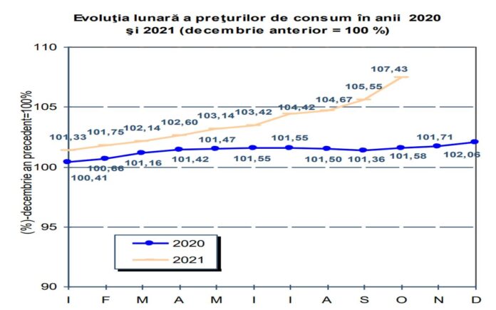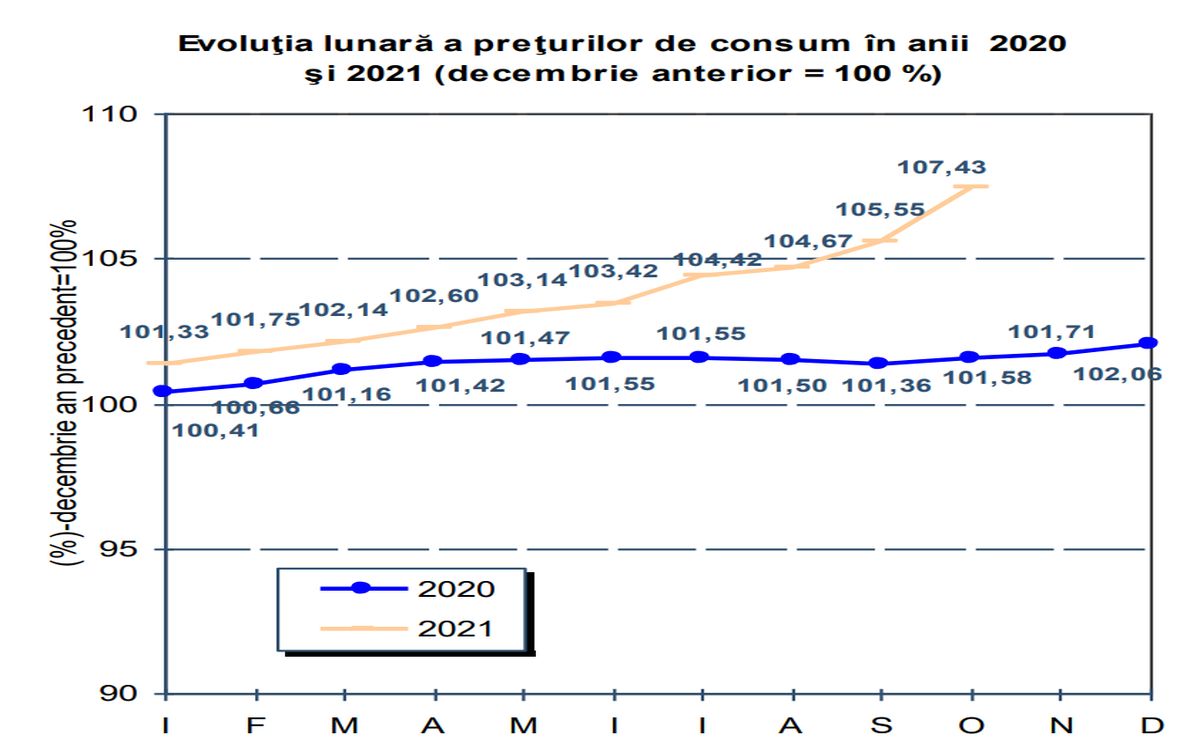 Conform Direcției Județene de Statistică Bacău, indicele prețurilor de consum a crescut cu 7,94% în luna octombrie 2021 față de luna similara a anului 2020 și cu 1,78% față de septembrie 2021.