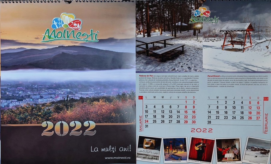 Calendarul de perete, varianta 2022, al Municipiului Moinești a apărut cu imagini ale principalelor obiective turistice modernizate și realizate de-a lungul anilor în această urbe.