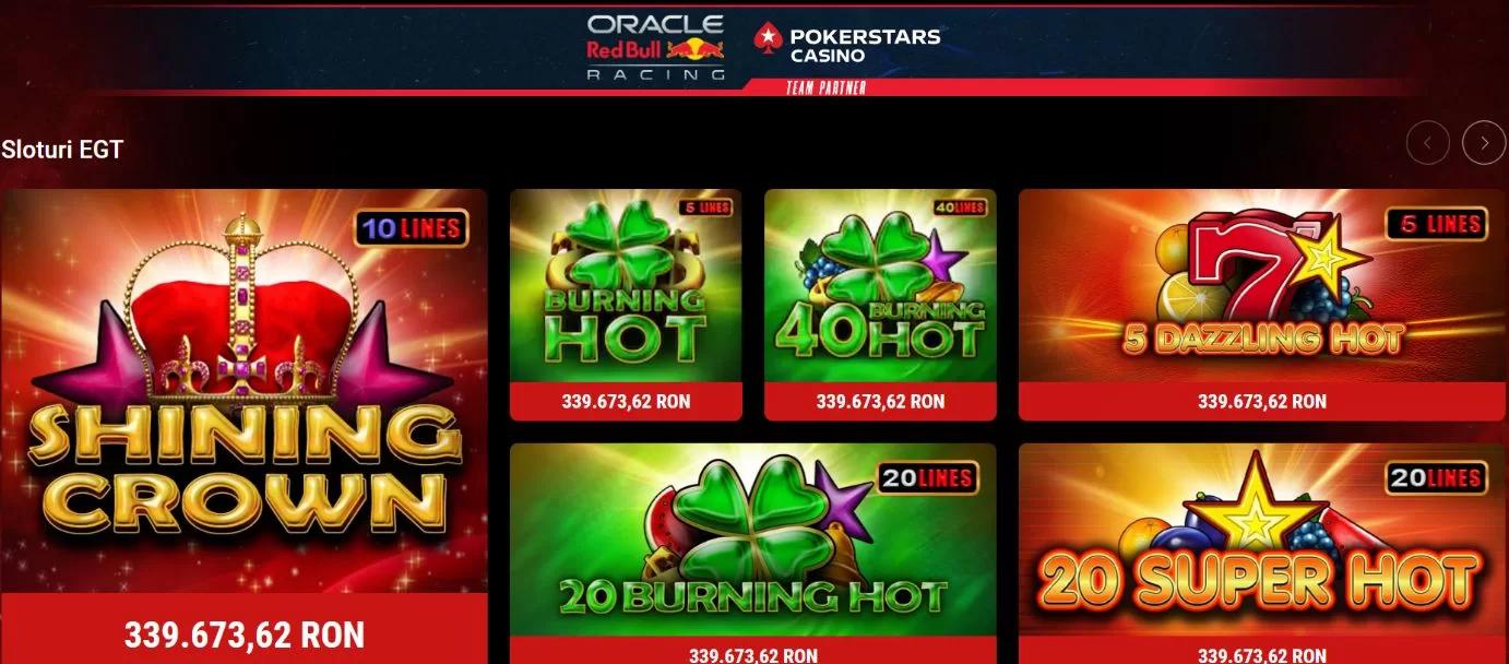 Prima depunere: 200 rotiri gratuite la Shining Crown, oferite consecutiv, câte 40 pe zi! + 200 rotiri gratuite la Burning Hot, oferite instant după verificarea contului și prima depunere! 100% bonus: faci o primă depunere iar cazinoul egalează suma până la 900 RON.