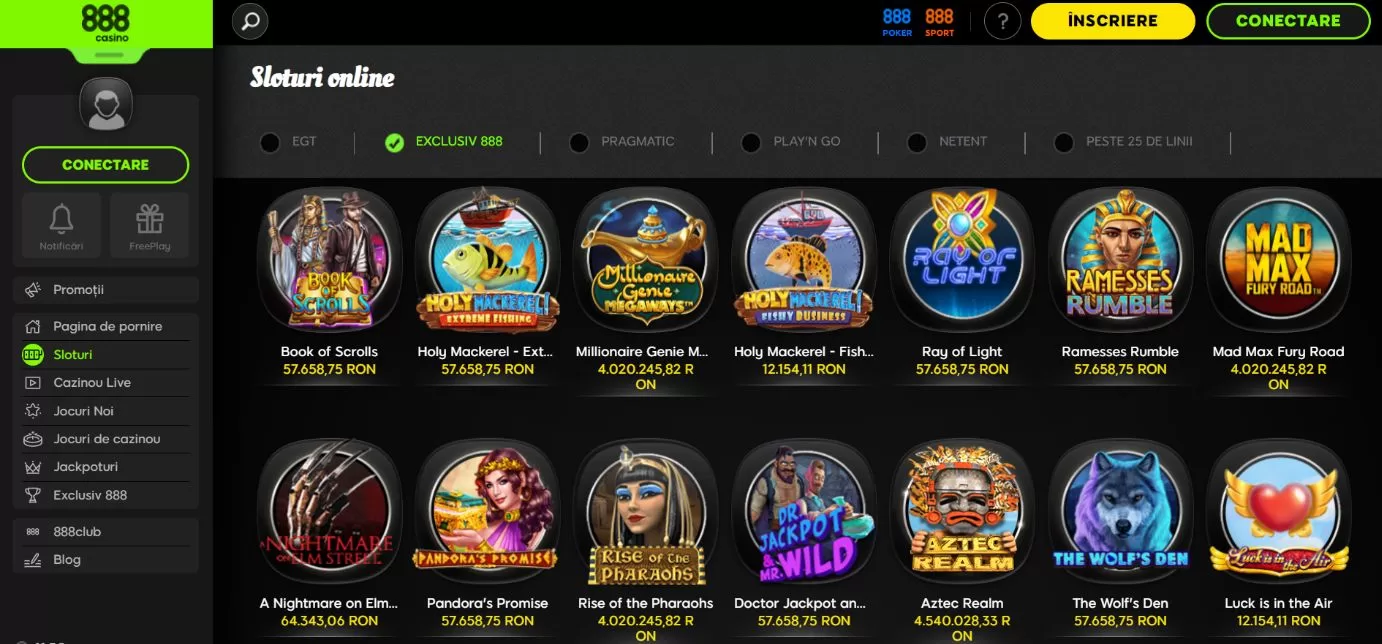 Site-ul online 888casino poate părea elitist, și nu este tocmai greșit să spunem așa pentru că administratorii țin foarte tare la etichetă. Cazinoul nu oferă cele mai multe jocuri ca număr, dar selecția este foarte bine realizată din punct de vedere al temelor, caracteristici, exclusivitate și funcții bonus. Primează jocurile cu funcții bonus și Jackpoturi, achiziționate strict de la cei mai cunoscuți furnizori din lume.