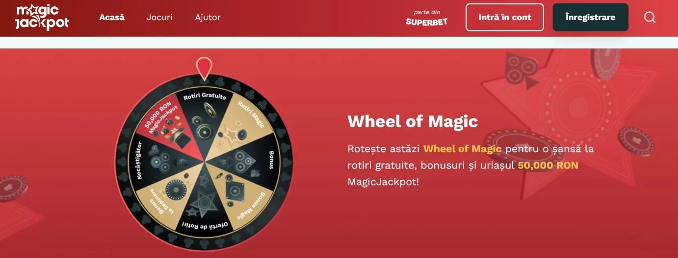 Acest site de jocuri de noroc online are peste 900 de jocuri de păcănele și mese cu dealer live casino. Întâmpină clienții fideli cu Wheel of Magic la care poți să rotești pentru șansa la rotiri gratuite, bonusuri sau mega Jackpot. Sună bine, dar nu este singurul beneficiu pe care-l primești dacă îți faci cont la MagicJackpot. În afara bonusului de bun venit poți accesa alte trei tipuri diferite de bonusuri cu rotiri gratuite.