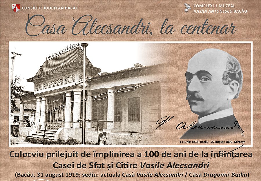 Vineri, 30 august, la ora 11.00, la Complexul Muzeal „Iulian Antonescu” Bacău, va avea loc Colocviul “100 de ani de la înfiinţarea Casei de Sfat şi Citire «V. Alecsandri»”, care a avut sediul în actuala casă unde, spun mai multe surse, a aparţinut familiei Alecsandri.