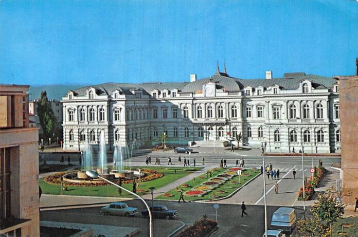 Această fotografie din anii ’70 surprinde o imagine vibrantă și pitorească a centrului municipiului Bacău, ilustrând Palatul Administrativ în toată splendoarea sa arhitecturală. Clădirea impunătoare, cu stilul său neoclasic, servea ca sediu al autorităților locale, fiind și astăzi un reper central al orașului.