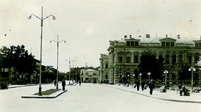 În această imagine de epocă, care datează din perioada interbelică, este surprins centrul orașului Bacău, un loc care a suferit transformări semnificative de-a lungul decadelor. În partea dreaptă a imaginii se poate observa impunătoarea clădire a Palatului Administrativ, un edificiu de referință în arhitectura urbană a orașului din acea perioadă. Această clădire, cu detaliile sale arhitecturale elaborate și proporțiile sale grandioase, reprezenta centrul vieții politice și administrative din Bacău.