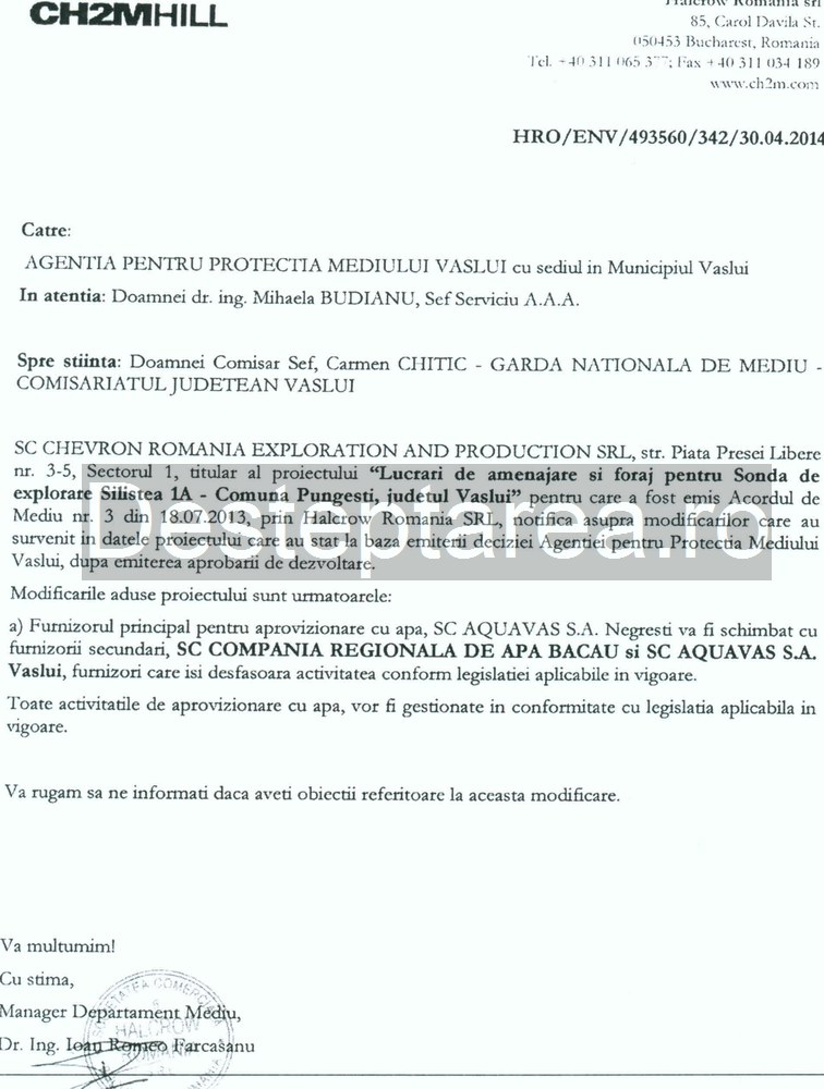 “Avem, intr-adevar, un contract cu Halliburton prin care le livram apa de la aductiunea din comuna Traian. De Chevron nu stiu, noi lucram cu Halliburton” – ne-a declarat Razvan Gaina, directorul CRAB.