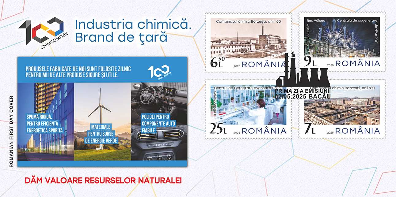Emisiunea, care cuprinde patru timbre, o coliță dantelată și un plic „prima zi”, aduce un omagiu contribuției remarcabile a Chimcomplex, la dezvoltarea industriei chimice din România, dar și rolului său de lider regional în tranziția către o economie verde.