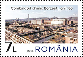 Timbrul cu valoarea nominală de 7 lei prezintă Combinatul chimic Borzești în anii ’80, într-o perioadă de maximă dezvoltare industrială. Fotografia reflectă amploarea și complexitatea instalațiilor și infrastructurii, confirmând importanța strategică a unității în context național și internațional.