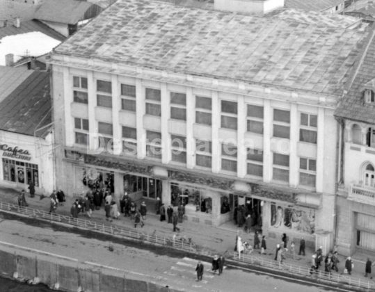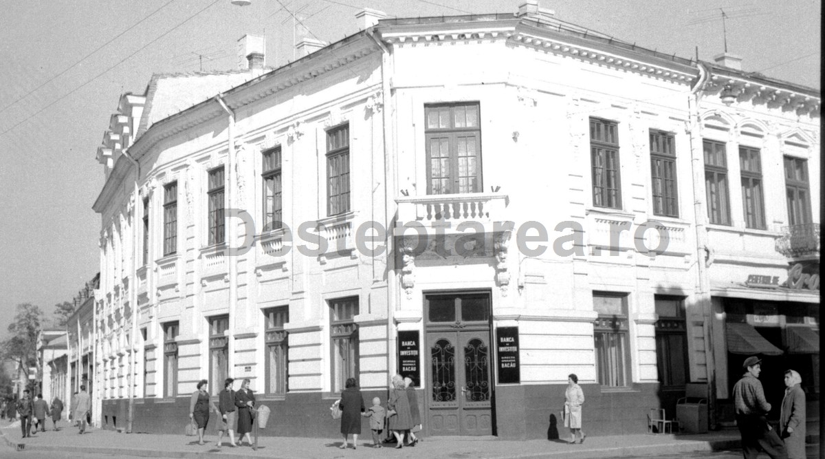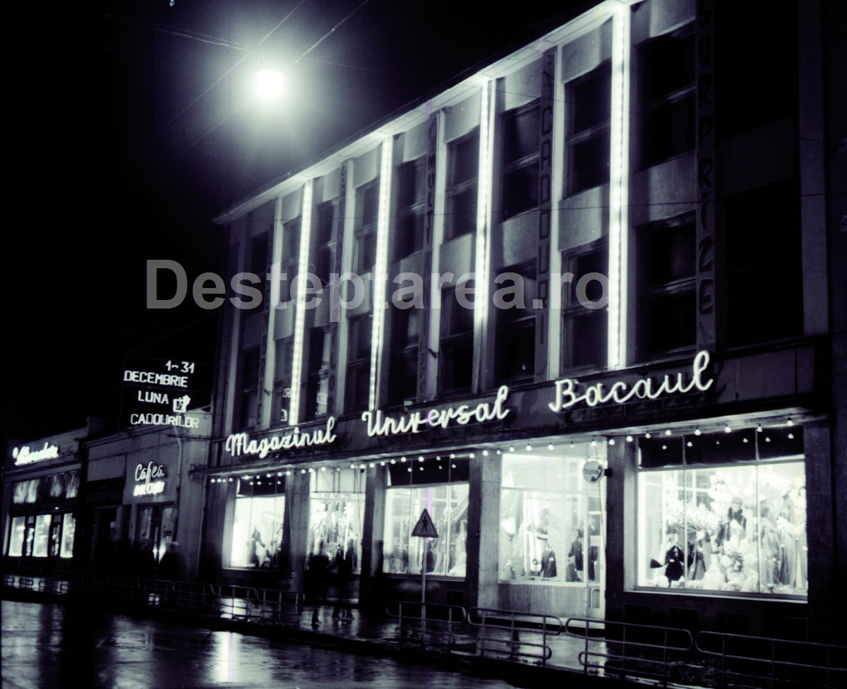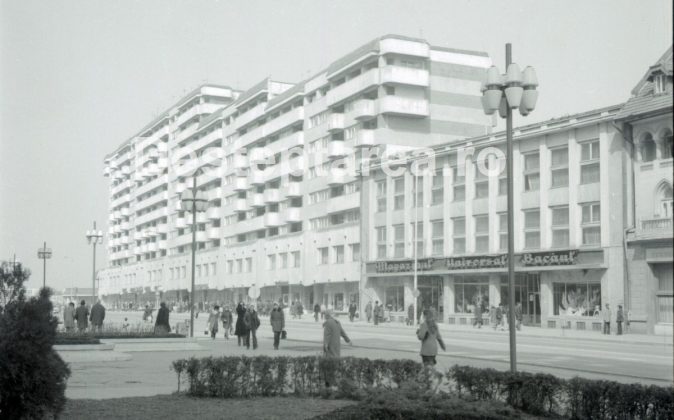 Doar târnacopul, lopata și roaba. Opreau trecătorii și se uitau cum le transpiră fraierilor cămeșile. Așa se uită și cei de la 416, astăzi, la cei care le culeg, veniți din alte județe, viile. Au săpat lipovenii pe lângă fundația teatrului și beciurile megieșilor, ridicând o clădire modernă, cu două etaje, funcțională fără bulină roșie și astăzi. Magazinul a deschis băcăuanilor apetitul pentru cumpărături, doi ani mai târziu, în 1961, când a fost dat în folosință. Clădirea telefoanelor avea să-i preia ceva, arhitectural, din fațadă. Văzut de sus, tot ansamblul… are schepsisul lui.