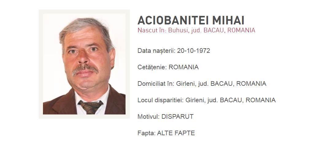 Un bărbat în vârstă de 50 de ani, identificat ca fiind ACIOBĂNIȚEI MIHAI, a dispărut din localitatea sa de domiciliu, Girleni, jud. Bacau.