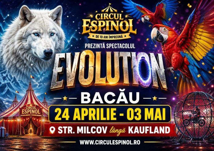 În perioada 24 aprilie – 3 mai, Circul Espinol vă invită la „Evolution”, un spectacol plin de energie, acrobații spectaculoase și momente de umor pentru întreaga familie. Ne găsiți în Bacău, pe strada Milcov nr. 5, lângă Kaufland.
