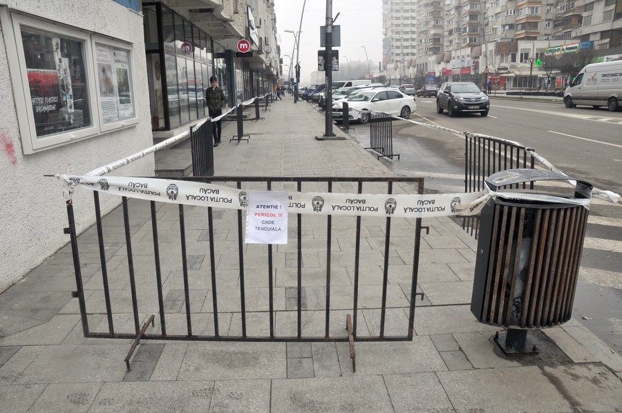 Joi dimineață, o bucată de tencuială s-a desprins de pe fațada imobilului amintit și a ajuns pe trotuar.