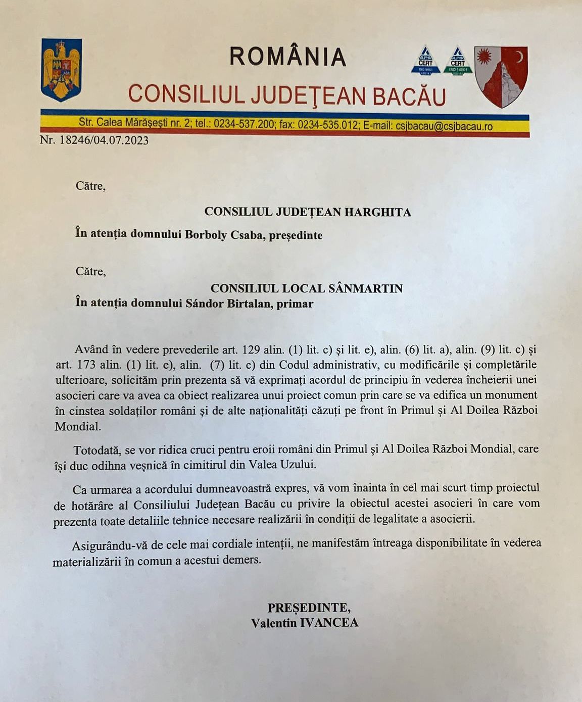 Președintele CJ Bacău Valentin Ivancea a adresat o solicitare către primarul comunei harghitene Sânmartin, Sândor Birtalan, pentru a obține acordul de principiu în vederea încheierii unei asocieri cu obiectivul de a realiza un proiect comun pentru amplasarea unui monument în cinstea soldaților români și de alte naționalități căzuți pe front în Primul și Al Doilea Război Mondial.
