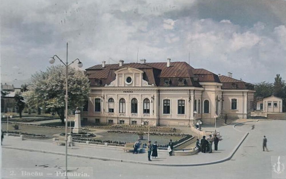 Imaginea surprinde clădirea Primăriei din Bacău la începutul secolului XX, o construcție deosebită ce reflectă arhitectura neoclasică a vremii. Aceasta era un simbol al administrației locale și o piesă centrală a orașului, emanând un aer elegant, cu detalii ornamentale și simetrie clasică. Deși funcționează și astăzi sub administrația Primăriei, această clădire nu mai este principalul sediu al instituției. La un moment dat, edificiul a fost transformat în Biblioteca Județeană, fiind un loc important pentru cultura locală.