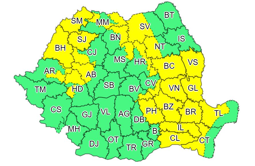 Se vor afla sub Cod galben judeţele Bacău, Vaslui, Vrancea, Galaţi, Buzău, Prahova, Brăila, Ialomiţa, Călăraşi, Bihor, Satu Mare, Sălaj (integral) şi parţial judeţele Tulcea, Constanţa, Neamţ, Suceava, Harghita, Mureş, Bistriţa-Năsăud, Maramureş, Cluj, Alba, Hunedoara, Arad, Braşov şi Covasna.