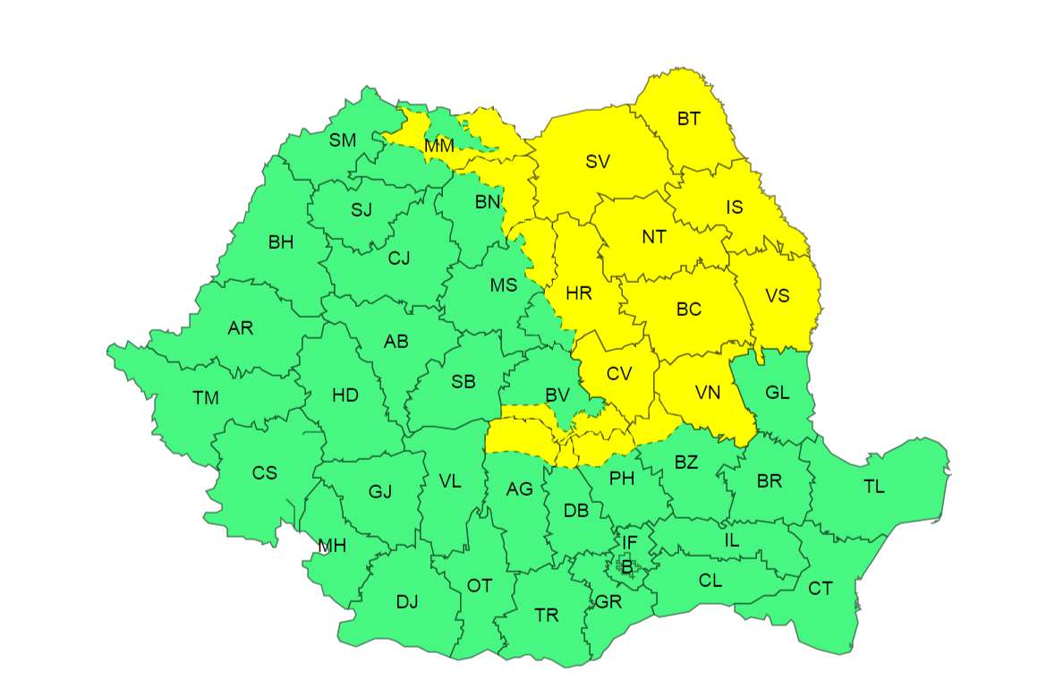 Administrația Națională de Meteorologie a emis și o atenționare de cod galben pentru cantități de apă însemnate, valabilă din 28 mai, ora 16, până pe 29 mai, ora 16. Zonele afectate includ cea mai mare parte a Moldovei, estul Transilvaniei, Carpații Orientali și jumătatea de est a Carpaților Meridionali.