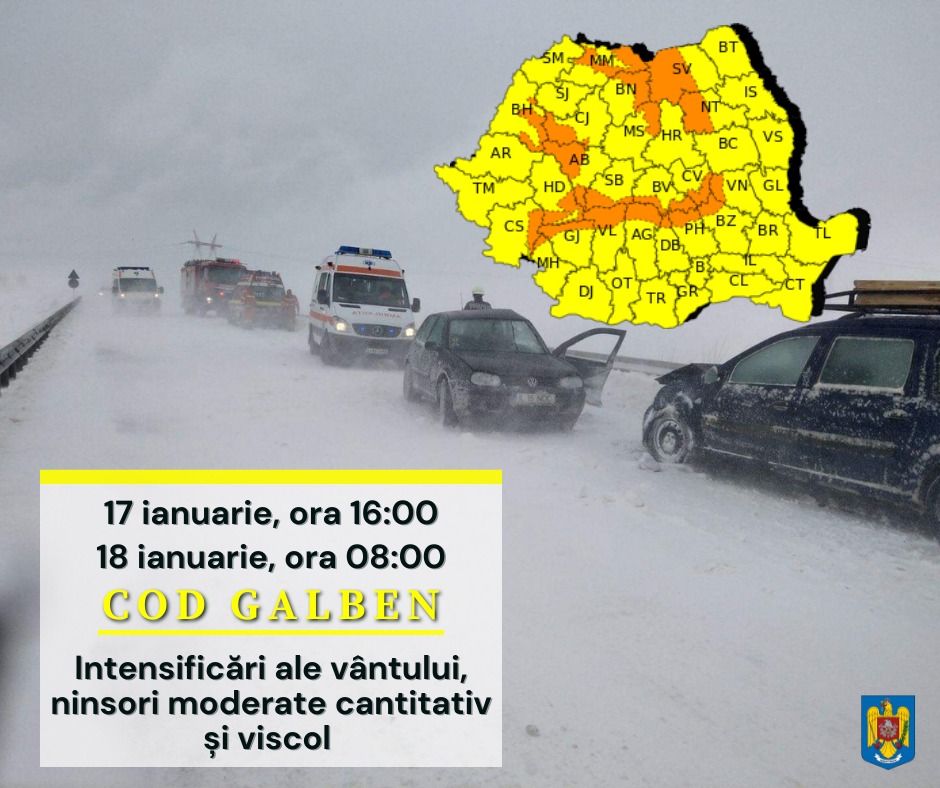 Administrația Națională de Meteorologie a emis o atenționare meteorologică COD GALBEN valabilă în intervalul 17 ianuarie, ora 16:00 – 18 ianuarie, ora 08:00, ce vizează intensificări ale vântului în cea mai mare parte a țării, ninsori moderate cantitativ, viscol în zona de munte și local, în jumătatea nordică.