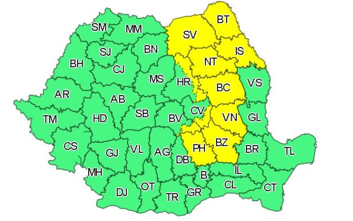 Judeţele vizate de această avertizare sunt: Bacău, Botoşani, Braşov, Buzău, Covasna, Harghita, Iaşi, Neamţ, Prahova, Suceava şi Vrancea.