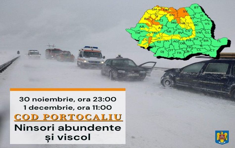 Administrația Națională de Meteorologie a emis o avertizare meteorologică COD PORTOCALIU valabilă în intervalul 30 noiembrie, ora 23 – 01 decembrie, ora 11, ce vizează ninsori abundente și viscol la altitudini de peste 1500 m în nordul Carpaților Orientali, local în Carpații Occidentali și în vestul Carpaților Meridionali.