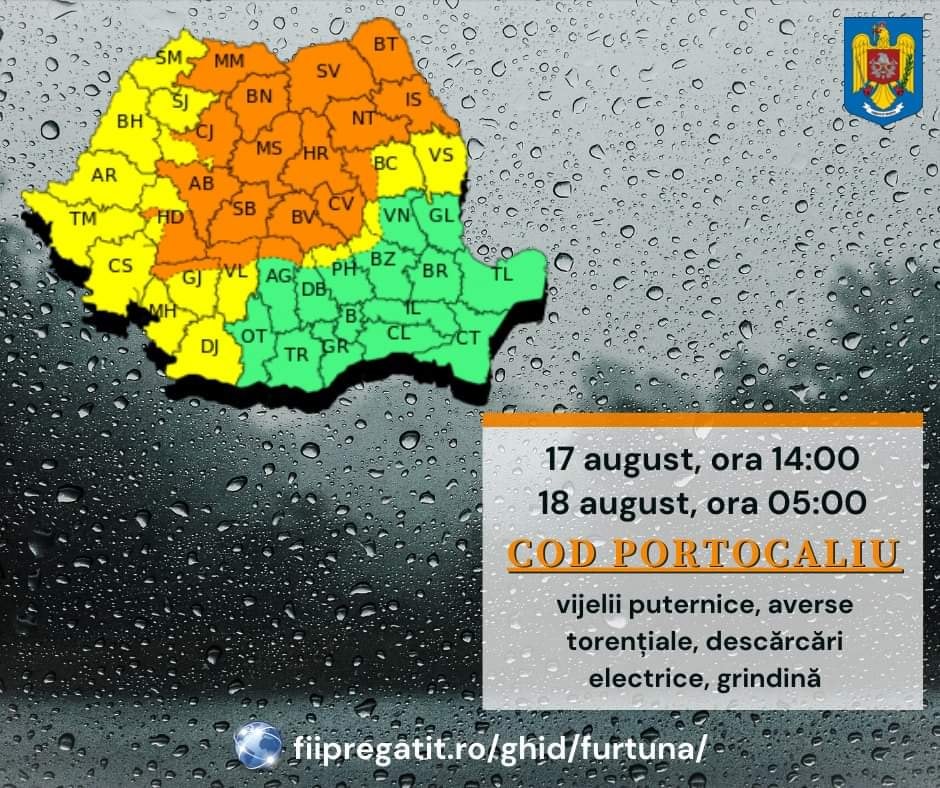 Cod Portocaliu de vijelii puternice, averse torențiale, frecvente descărcări electrice și grindină, valabil de astăzi de la ora 14 până mâine la ora 05. Rafalele de vânt vor atinge 70-90 km/h, iar cantitățile de apă vor depăși 30…40 l/mp și izolat 50…60 l/mp.
