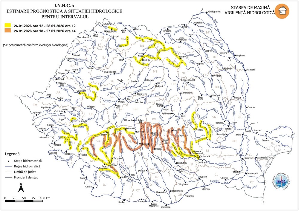 Având în vedere situația hidrometeorologică actuală și prognoza pentru următoarele 48 de ore, Institutul Național de Hidrologie și Gospodărire a Apelor (INHGA) a instituit Cod Portocaliu de inundații, valabil în intervalul 26 ianuarie, ora 18:00 – 27 ianuarie, ora 14:00.