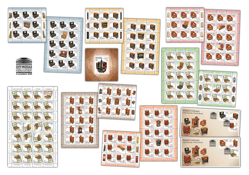 Emisiunea de mărci poştale „Colecţiilor româneşti. Cutii muzicale” este completată de cele două plicuri „prima zi”, coala de 27 timbre + 1 vinietă + 14 tabsuri şi tete-beche, minicoala de 13 timbre + 2 viniete diferite + 10 tabsuri, minicoala de 8 timbre + 1 vinietă + 6 tabsuri şi coliţă dantelată.