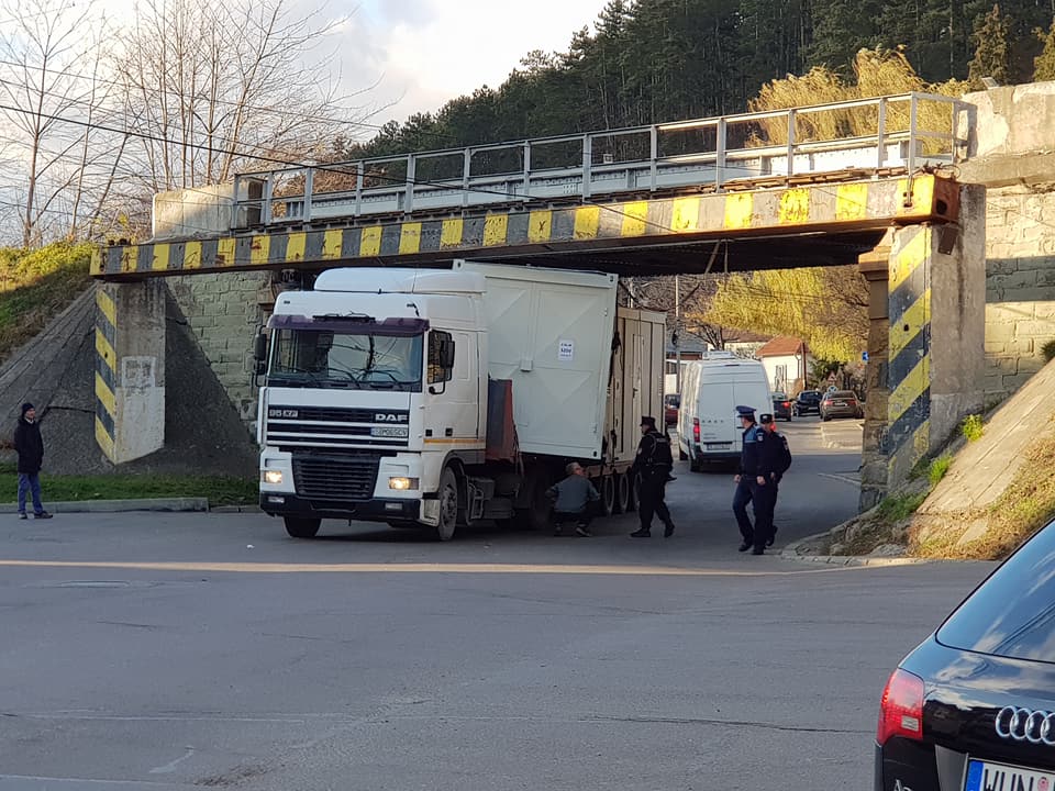În această după-amiază, un TIR a rămas blocat sub un pod de cale ferată, din oraşul Comăneşti.