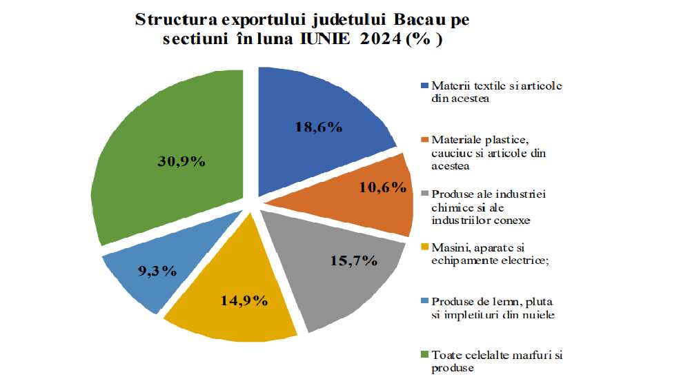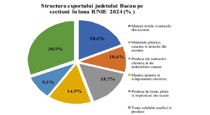 Ceea ce ne interesează cel mai mult sunt categoriile de produse. Cele mai multe mărfuri exportate provin din secțiunea “materii textile și articole din acestea”, reprezentând 18,6% din total. Asta ne face să ne întrebăm: e Bacăul pe cale să devină capitala modei textile? Pe locul doi se află “produse ale industriei chimice și ale industriilor conexe” (15,7%), iar pe trei “mașini, aparate și echipamente electrice” (14,9%). O diversificare interesantă, dar sunt acestea suficiente pentru a susține economia locală?