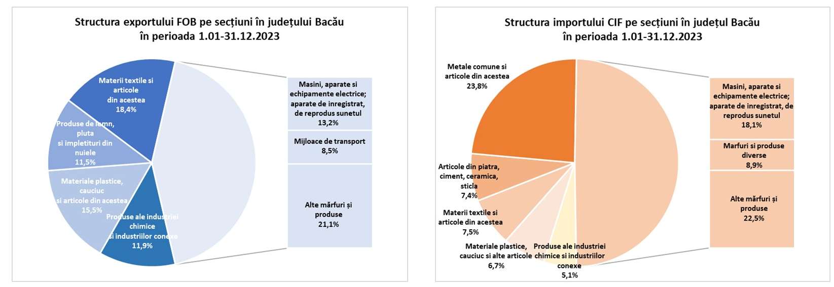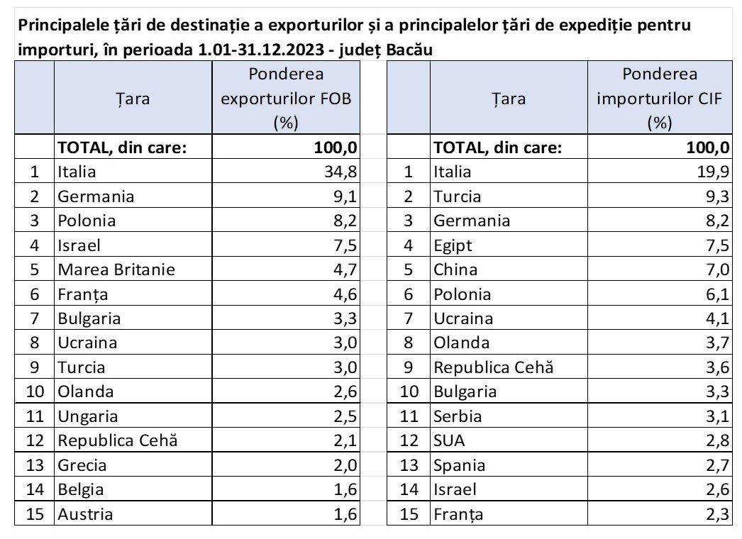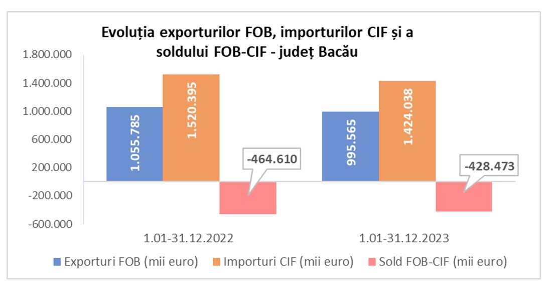 Datele statistice pentru anul 2023 arată o scădere semnificativă a exporturilor și importurilor din Județul Bacău, potrivit raportului publicat de Biroul de Statistică.