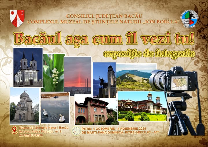 Complexul Muzeal de Științele Naturii „Ion Borcea” din Bacău organizează, pe 4 octombrie 2025, la ora 13:00, vernisajul expoziției de fotografie intitulată „Bacăul așa cum îl vezi tu”, care va avea loc la sediul muzeului, situat pe strada Aleea Parcului nr. 9. Evenimentul face parte din proiectul cultural „Promovăm patrimoniul băcăuan”.