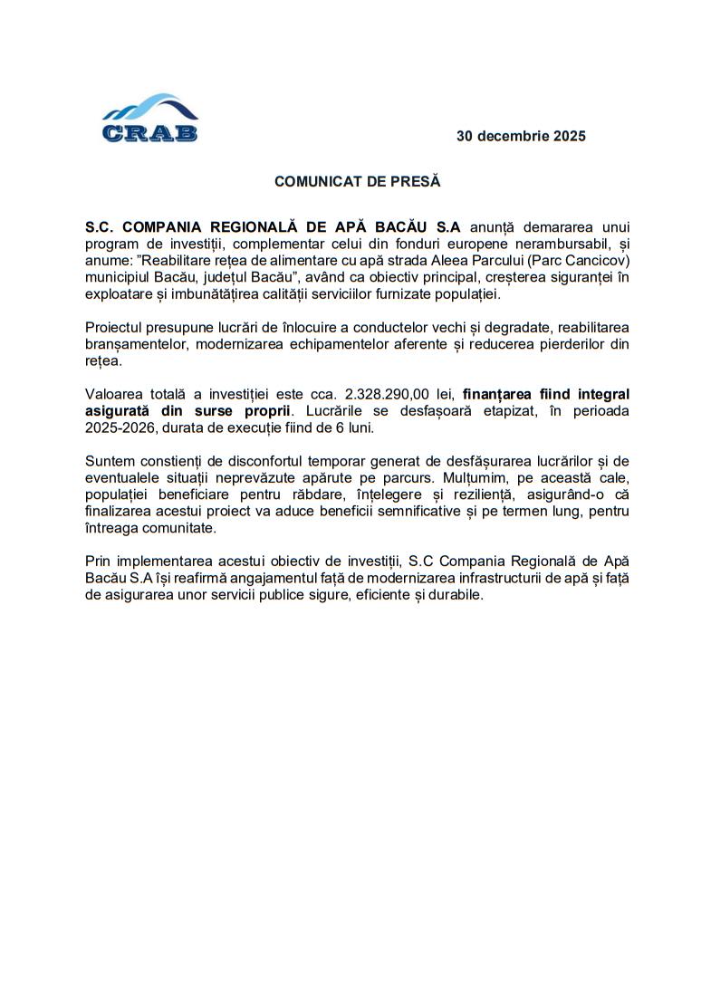 Comunicat de presăComunicat de presă Deșteptarea30 decembrie 2025AcțiuneFacebookTwitterWhatsAppTelegramVK AcțiuneFacebookTwitterWhatsAppTelegramVK Dorinel Umbrărescu preia activele ArcelorMittal Hunedoara într-o tranzacţie de 12,5 milioane de euroMăsuri de ordine publică la manifestările tradiționale de Anul Nou din localitatea OituzMoinești: Parada cetelor de urși și mascațiBacăul la 12 ani de la proclamarea Republicii, reflectat în presa anului 1959Jandarmii băcăuani, alături de comunitate pentru siguranța sărbătorilor de iarnăRepublica fără zi, monarhia fără rege și frica de a ne spune pe numeInima nu doare întotdeauna: De ce controlul cardiologic este vital chiar și în lipsa simptomelor evidenteSprijin extins pentru consumatorii vulnerabili de energie: ajutorul de 50 de lei pe lună se prelungește până la finalul lui 2026Manichiură perfectă acasă: tot ce îți trebuie pentru unghii de milioaneDrumul Expres Suceava–Siret intră în etapa de licitație. Proiect strategic finanțat prin programul SAFEIncendiu la o cabană din Ghimeș-Făget, pompierii au intervenit rapidTradiția a prins glas, iar muntele de sare a devenit scenă