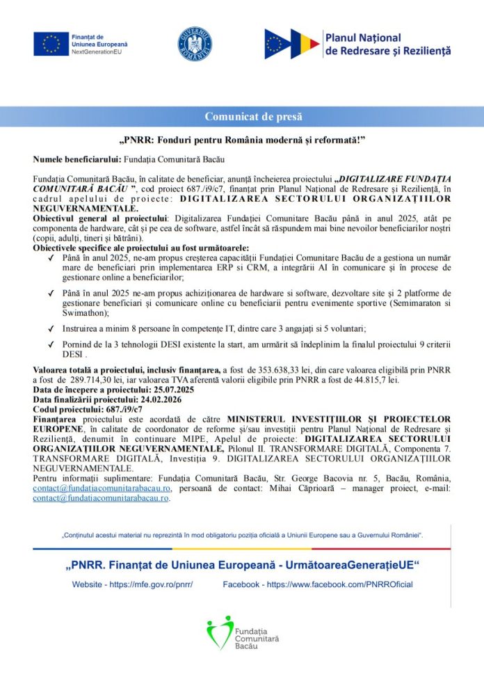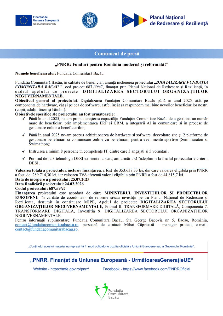 Comunicat de presăComunicat de presă Deșteptarea12 februarie 2026AcțiuneFacebookTwitterWhatsAppTelegramVK AcțiuneFacebookTwitterWhatsAppTelegramVK Trei bărbați reținuți pentru furt calificat de polițiștii Secției 4 Poliție Rurală Podu TurculuiMoinești: Primarul Valentin Vieru, pe teren pentru monitorizarea lucrărilor de extindere a rețelelor de apă și canalizareFemeie reținută pentru înșelăciune, după ce ar fi vândut pește și carne de pui la suprapreț unor bătrâne din ComăneștiPolițiștii băcăuani au adunat elevii chiulangii din baruriCe spune Compania de Apă despre avaria care a lăsat Bacăul pe uscatBacău: Intervenție chirurgicală complexă realizată cu succes la un pacient de 87 de ani, la SJUSerile Bacoviene – Remember Octavian Voicu (28 octombrie 1940 – 7 ianuarie 2005)Detaliul care schimbă totul în amenajarea băiiZiua Internațională a Siguranței pe Internet, marcată prin activități preventive în județul BacăuAnaliză | Piața construcțiilor din județul Bacău: creștere a lucrărilor, dar semnale de prudență în sectorul rezidențialStimulentul de inserție: sprijin financiar pentru părinții care revin mai devreme la muncăCum ar arăta restaurarea Casei Alecsandri, în viziunea profesorului Lucian Șerban