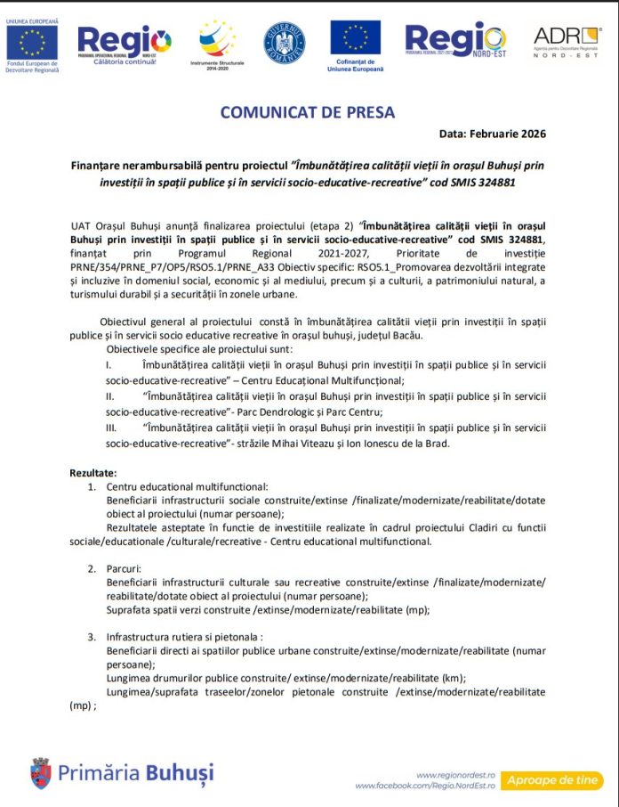 Comunicat de presăComunicat de presă Deșteptarea19 februarie 2026AcțiuneFacebookTwitterWhatsAppTelegramVK AcțiuneFacebookTwitterWhatsAppTelegramVK Percheziție în Racova, într-un dosar de furt calificat instrumentat la solicitarea autorităților belgieneBuhuși: Rată de ocupare de 88,4% la Spitalul „Prof. Dr. Eduard Apetrei”Bilanț 2025: peste 11.000 de misiuni, 6.000 de sancțiuni și 300 de infracțiuni constatate de jandarmii băcăuaniÎnvățare, nutriție și echilibru – eveniment dedicat alimentației conștiente, realizat la Palatul Copiilor BacăuIntervenții ale jandarmilor băcăuani în contextul avertizărilor de vreme severăTânără însărcinată, scoasă din nămeți și transportată la spital în siguranță de către polițiștiCRAB: Rezerva de Apă a Bacăului a fost suprasolicitată în avaria din februarie 2026. Sistemul nu poate acoperi singur consumul orașuluiJudo/ Cupa „Mărțișorul”: CSM- Palatul Copiilor Bacău, mărțișoare în februarieUn premiu important pentru revista de cultură ATENEUVIDEO: AUR cere demisia viceprimarului comunei BuhociBacău: CJ accelerează pașii pentru finalizarea Pavilionului Municipal, finanțare de peste 56,7 milioane euro prin Programul SănătateImpozitele locale în 2026: ce trebuie să știe persoanele fizice despre taxe și noile reguli