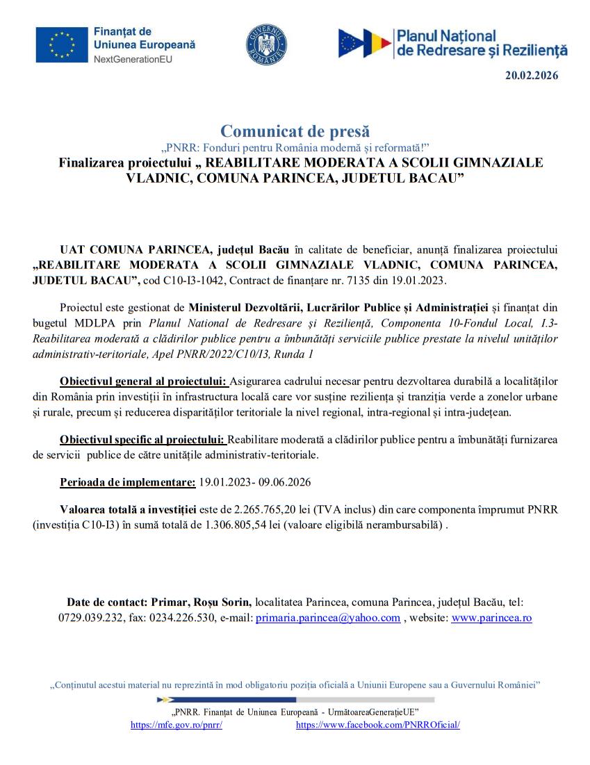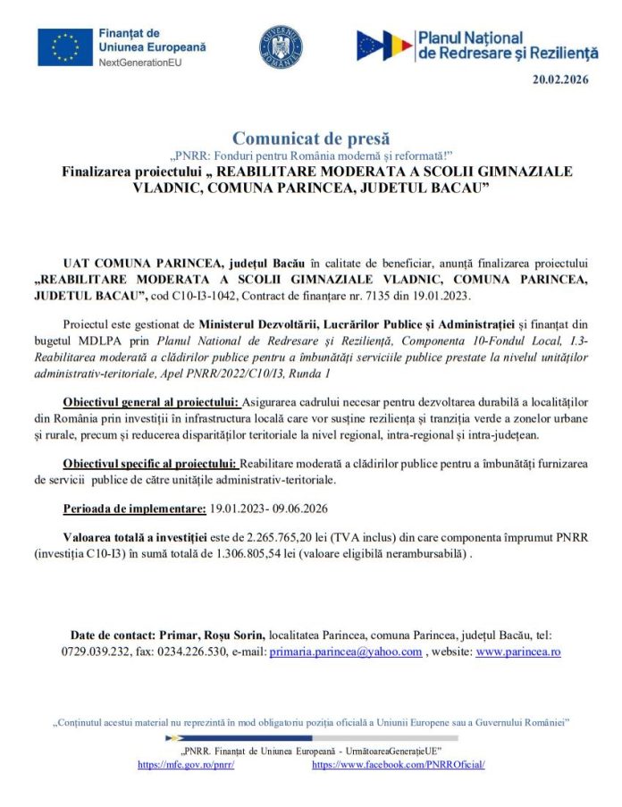 Comunicat de presăComunicat de presă Deșteptarea20 februarie 2026AcțiuneFacebookTwitterWhatsAppTelegramVK AcțiuneFacebookTwitterWhatsAppTelegramVK 100 de vârstnici din județul Bacău, consultații oftalmologice și ochelari gratuit prin campania „Ajută un bătrân să zâmbească”Un pacient cu infarct a ajuns singur la Urgențe și a fost salvat de echipa medicalăCaptură de peste 200 mc de lemn și amenzi de 40.000 de lei, în urma unei acțiuni de amploare în BacăuConfortul care te însoțește peste tot: de ce pantalonii de trening pentru bărbați sunt piesa de bază a garderobei moderne„Resetarea” termenelor în urbanism: dosarele blocate intră sub regula avizării taciteLupte greco-romane: CSS Bacău calificări in corpore la turneul final școlarTurele pentru vehicule blindate, fabricate la Bacău în cadrul unui contract de 277 milioane de dolari câștigat de Elbit SystemsSiguranță pe munte: Recomandările jandarmilor montani din Slănic MoldovaAtletism: Martin Benchea Joca continuă să fie de neopritAdeverințele de venit pentru pensie ar putea fi eliberate și pe baza fișelor de salariu, nu doar a statelor de platăPercheziție în Racova, într-un dosar de furt calificat instrumentat la solicitarea autorităților belgieneBuhuși: Rată de ocupare de 88,4% la Spitalul „Prof. Dr. Eduard Apetrei”