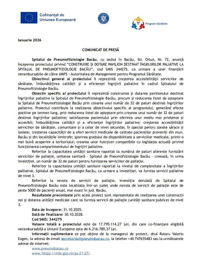 Comunicat de presăComunicat de presă Deșteptarea18 martie 2026AcțiuneFacebookTwitterWhatsAppTelegramVK AcțiuneFacebookTwitterWhatsAppTelegramVK Bacău: Urmărire în trafic și accident cu trei răniți, provocat de un șofer fără permisPolițiștii, alături de preșcolarii Școlii „Miron Costin” din BacăuA fost inițiat procesul de elaborare a noului Plan Urbanistic GeneralTârgu Ocna: 570 de locuri scoase la concurs la Școala Națională de Poliție Penitenciară pentru sesiunea iunie 2026Zootehnia din Bacău în 2025: mai puțină carne, dar animale mai productiveLegea privind apărarea împotriva incendiilor, modificată: avize mai rapide, proceduri digitale și sancțiuni mai dureDescoperă un monument istoric de suflet: Biserica „Sfinții Voievozi” din Fântânele238 de elevi au participat la etapa județeană a Olimpiadei de Religie OrtodoxăMăsuri urgente pentru refacerea unui pod pe DN 2G și stabilizarea unei alunecări de teren la Luizi-CălugăraMedicina longevității la Slănic Moldova – Terapia Gerovital H3 aplicată la Complex Panoramic de unul dintre cei mai apreciați specialiști în geriatrie din România...Două persoane surprinse depozitând ilegal deșeuri în comuna Buhoci; primarul cere sancțiuni fermeGimnastică/ 2026- Anul Nadia Comăneci: Nadia, prestație de 10 în Parlamentul European