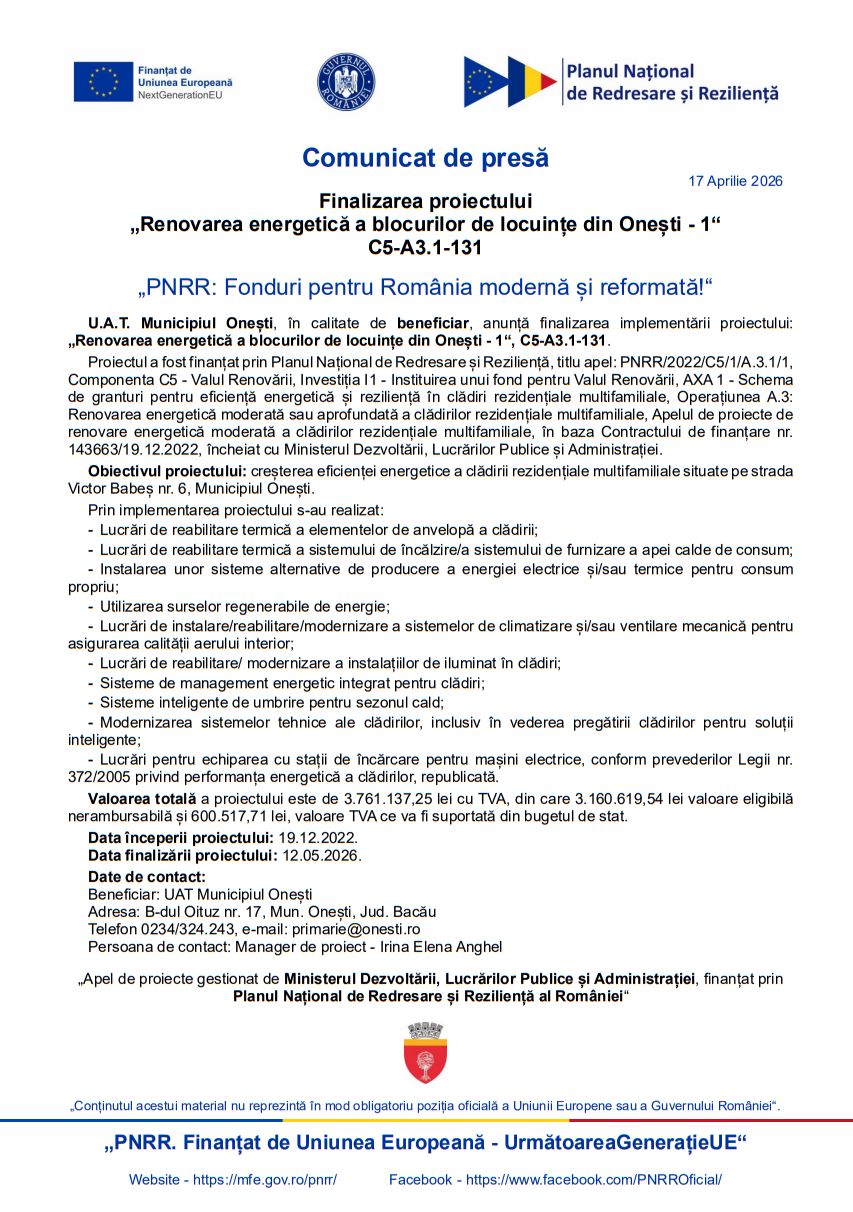 Comunicat de presăComunicat de presă Deșteptarea17 aprilie 2026AcțiuneFacebookXWhatsAppTelegramVK AcțiuneFacebookXWhatsAppTelegramVK Autostrada A7 Bacău–Pașcani: au început asfaltările la nodul rutier SăbăoaniPrimăria Bacău își reduce programul vineri, după ora 12:00, din cauza unei întreruperi de curentIar ne sperie autoritățile: lucrări de verificare la sirenele de alarmare din BacăuLucrări de reabilitare a rețelei de apă pe o stradă din municipiul BacăuIncendiu mortal la o locuință din OneștiȘtiința Bacău, între campionat, Cupă, Universitare și handbal pe plajăOperator economic sancționat cu 80.000 de lei de Garda de Mediu Bacău pentru nereguli în situl Natura 2000 „Siretul MijlociuElevi ai Colegiului Național „Gheorghe Vrănceanu” Bacău, premiați la Olimpiada Națională de FizicăInvestiție de peste 5,2 milioane de lei la SJU Bacău pentru o unitate dedicată pacienților cardiaci criticiPropunere legislativă pentru declararea zilei de 10 mai ca sărbătoare legală nelucrătoareStarbucks deschide prima cafenea din BacăuLa plimbare…