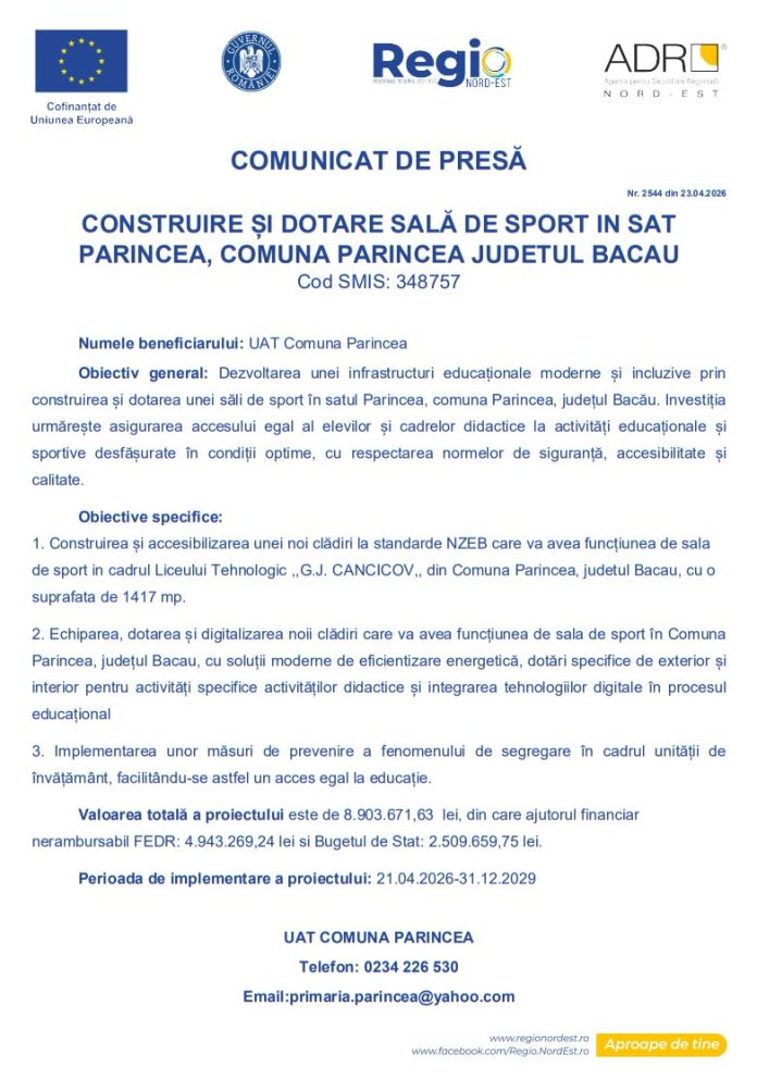 Comunicat de presăComunicat de presă Deșteptarea23 aprilie 2026AcțiuneFacebookXWhatsAppTelegramVK AcțiuneFacebookXWhatsAppTelegramVK Slănic-Moldova, în cursa pentru titlul „Destinația Anului 2026” la categoria Stațiuni BalneareZiua Sfântului Gheorghe – tradiție, credință și început de primăvarăConcursul regional pe teme economice „Ion Ionescu de la Brad”, ediția a VIII-a – etapa finală, la Facultatea de Științe Economice a Universității „Vasile...Omagiu patronului spiritual al Colegiului Național „Gheorghe Vrănceanu”, în anul împlinirii a 65 de ani de existențăConferința de presă AURPrimăria Onești lansează licitația pentru modernizarea Parcului „Libertății”Bacău: Banca Națională a României invită publicul la a șasea ediție a evenimentului „Zilele Porților Deschise”Manifestare educațional-culturală dedicată Zilei Internaționale a Romilor, la Târgu OcnaHotelul Central din Bacău – povestea unei clădiri care a văzut orașul schimbându-seDan Negru și Direcția 5, la un eveniment special în BacăuCircul Espinol aduce la Bacău spectacolul „Evolution”Începe balastarea liniilor industriale pentru UMB STEEL