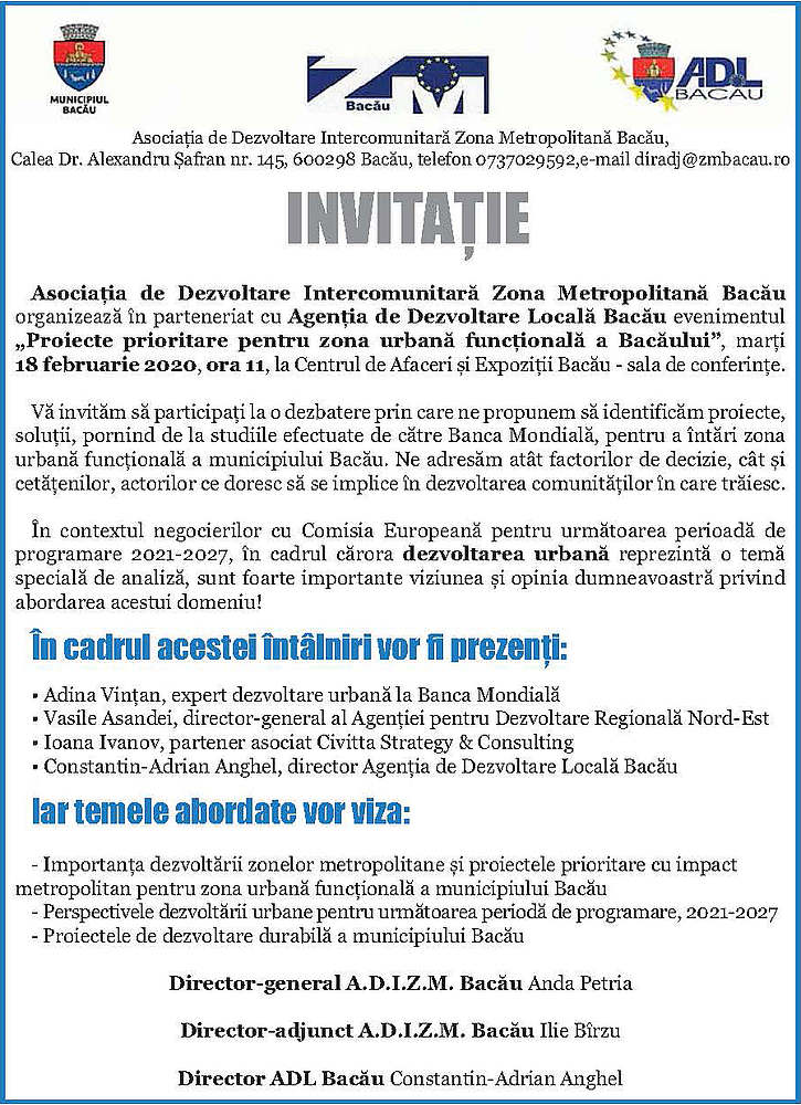 Comunicat de presăProiecte prioritare pentru zona urbană funcțională a Bacăuluide Comunicat de presa - 11 februarie 2020AcțiuneFacebookTwitterWhatsAppTelegramVK