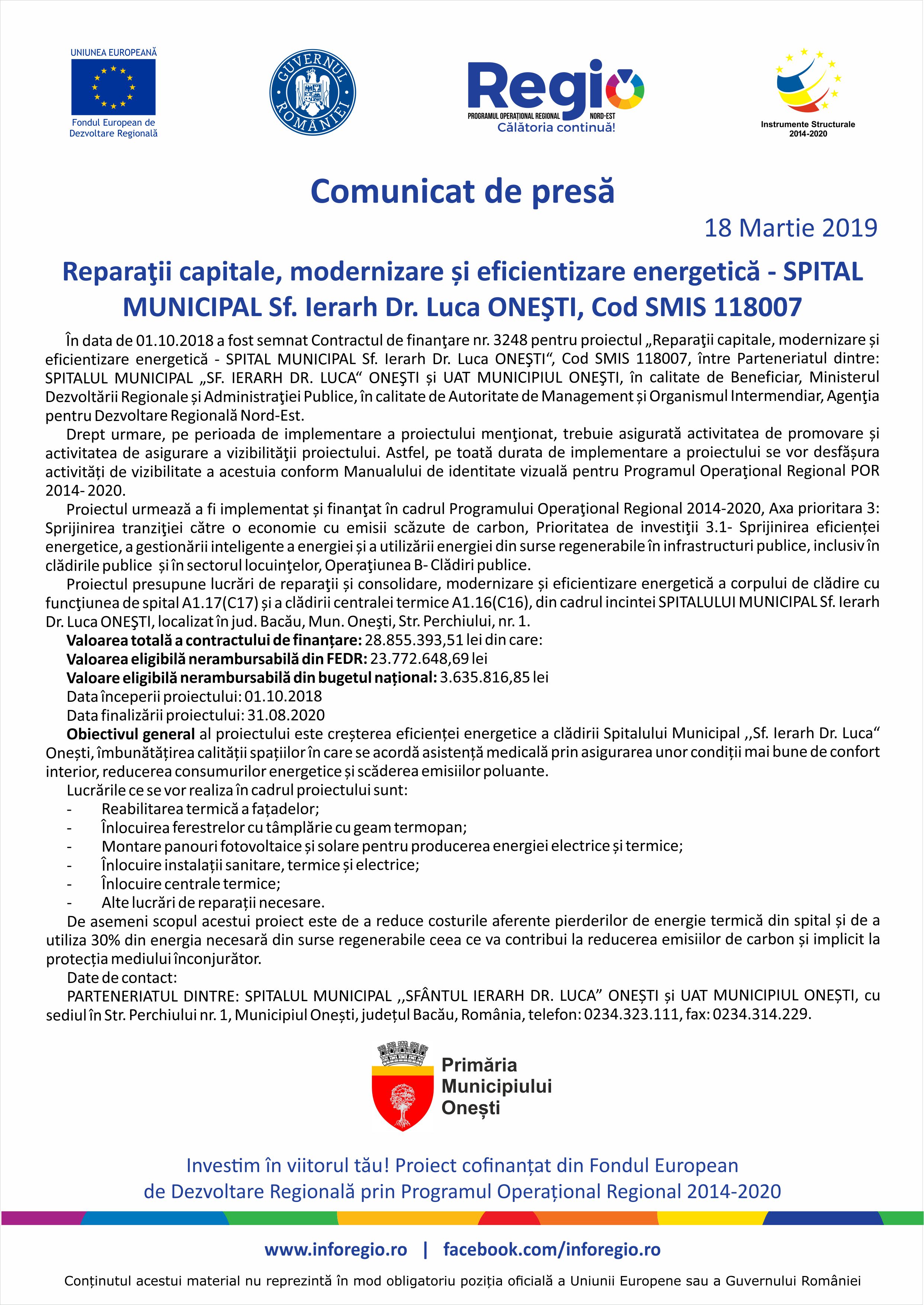 Reparații capitale, modernizare și eficientizare energetica la Spitalul muncipal Sf. Ierarh Dr. Luca Onești cod SMIS 118007