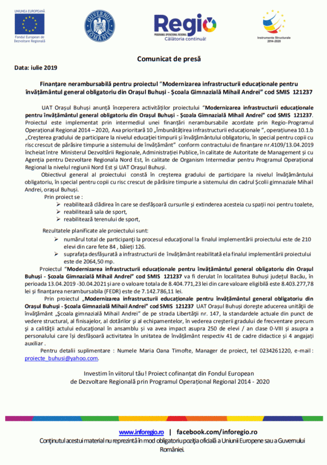 Finanțare nerambursabilă pentru proiectul “Modernizarea infrastructurii educaționale pentru învățământul general obligatoriu din Orașul Buhuși – Școala Gimnazială Mihail Andrei” cod SMIS 121237