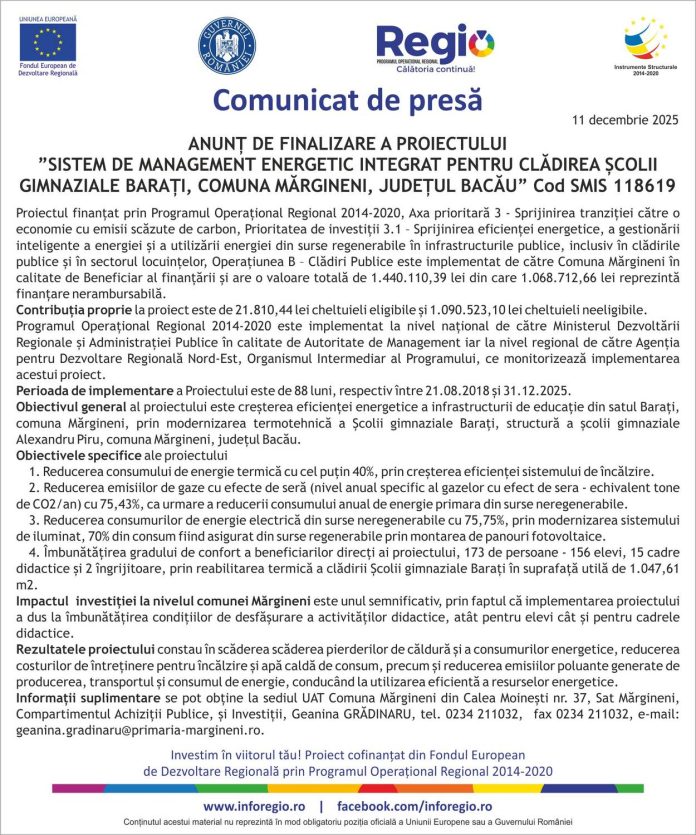 Comunicat de presăComunicat de presă Deșteptarea11 decembrie 2025AcțiuneFacebookTwitterWhatsAppTelegramVK AcțiuneFacebookTwitterWhatsAppTelegramVK Din stejar, stejar răsare! Dominick Dulhac pășește pe urmele tatălui său81 de intervenții ale pompierilor băcăuani în trei zile. Cele mai multe, urgențe medicaleBilanț IPJ Bacău 2025: Scad furturile și tâlhăriile, mai puține victime în accidente rutiereStație de autobuz de 50.000 de euro la Berzunți, cu încălzire în pardoseală și televizorSalina Târgu Ocna s-a umplut de inimioare și baloane roșii„Lecția fericirii la Vaasa: Cum integrează Yrkesakademin i Österbotten conceptul de Well-being în educație”Acțiune rutieră în sistem RELEU pe DN 15: 83 de sancțiuni aplicate de polițiștiTendințe 2026 în produse pentru casă funcționale și eleganteEconomia României: date oficiale arată încetinire și dificultăți, în pofida declarațiilor guvernamentale optimisteInformare Publică: Avarie pe strada Cașinului din municipiul Onești!Bacăul, al doilea județ din Regiunea Nord-Est la salarii. Peste media regională, dar încă sub nivelul naționalCoasigurarea la sănătate nu mai este gratuită: ce trebuie să știe cei care își iau în întreținere soțul sau părinții fără venituri